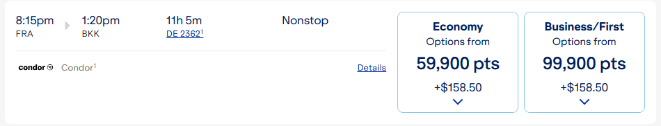 Ein Flug von Frankfurt nach Bangkok liegt bei knapp 60.000 Punkten in der Economy Class. Für ein Business Class Prämienticket müsst Ihr 100.000 Punkte berappen. Dazu kommen noch 158,50 USD an Steuern und Gebühren. Im Vergleich dazu kostet die Strecke zwischen Deutschland und Palma de Mallorca in der Economy Class 13.500 Punkte und etwas mehr als 70 USD.