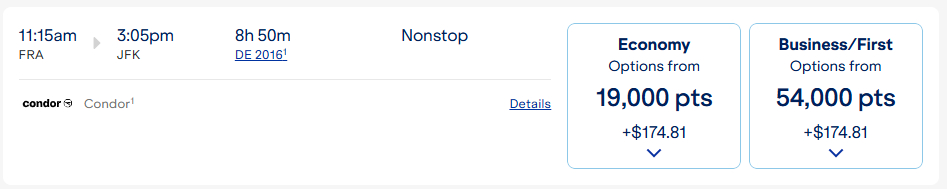 jetBlue hat keine offizielle Award Tabelle für Flüge mit Condor veröffentlicht. Die Prämienflugsuche gibt jedoch einen guten Eindruck, was ein mit Meilen gebuchter Sitzplatz im Flugzeug kostet. So müsst Ihr für den Klassiker Frankfurt – New York 19.000 Punkte in der Economy Class und 54.000 Punkte in der Business Class ausgeben. Hinzu kommen jeweils 175 USD Zuzahlung.