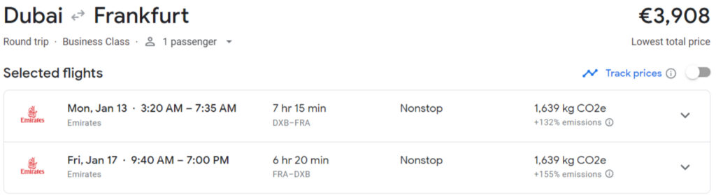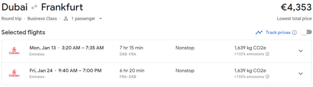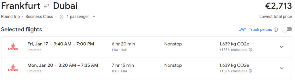 Schauen wir uns zunächst an einem Beispiel zwischen Frankfurt und Dubai an, wie eine ganz normale Reise gebucht werden könnte: