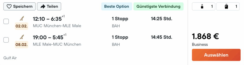Dabei sind diese Tarife recht breit verfügbar zwischen Dezember 2025 und Mai 2026 verfügbar, also auch zu besten Reisezeit für die Malediven. Die Flüge gehen in allen Fällen über den Hub von Gulf Air in Bahrain, wo man im neuen Terminal mit einer neuen Lounge, einen sehr angenehmen Flughafen für Transfers geschaffen hat.