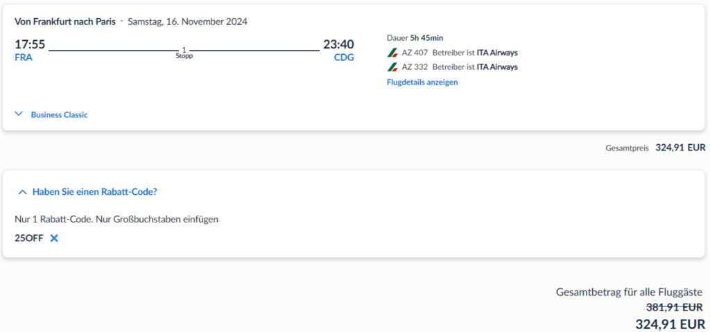 ITA Airways, das noch SkyTeam-Mitglied und zukünftige Lufthansa Airline, ist bekannt für regelmäßige Angebote und rabattierte Flugtickets. Noch für kurze Zeit gibt es einen Gutscheincode, bei dem Ihr Eure Flugreisen ab Deutschland günstiger machen könnt. Mit dem Gutscheincode „25OFF“ spart Ihr 25% auf den reinen Flugpreis.