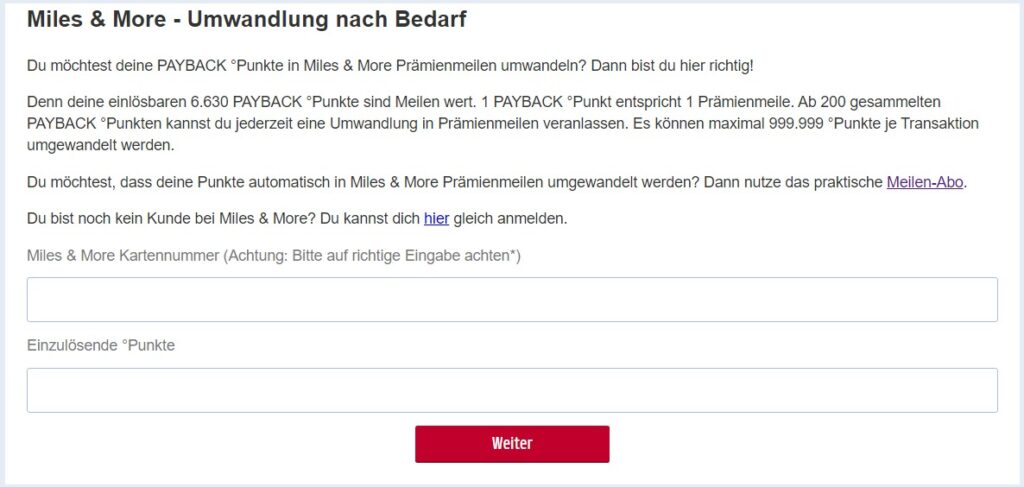Die Übertragung von Paybackpunkten zum Vielfliegerprogramm Miles & More ist recht simpel und kann auf zwei Wegen erfolgen. Da ist zum einen die einmalige Umwandlung nach Bedarf. Wann immer Ihr die Punkte im Verhältnis 1:1 zu Meilen machen wollt. Das geht über diese Seite von Payback, bei der Ihr Euch zunächst in Eurem eigenen Paybackkonto einloggen müsst und dann die gewünschte Menge an Paybackpunkten auf Euer Miles & More-Konto transferiert. Für eine Umwandlung zu Miles & More benötigt Ihr mindestn 200 Paybackpunkte. Maximal könnt Ihr 999.999 Paybackpunkte zu Miles & More übertragen.