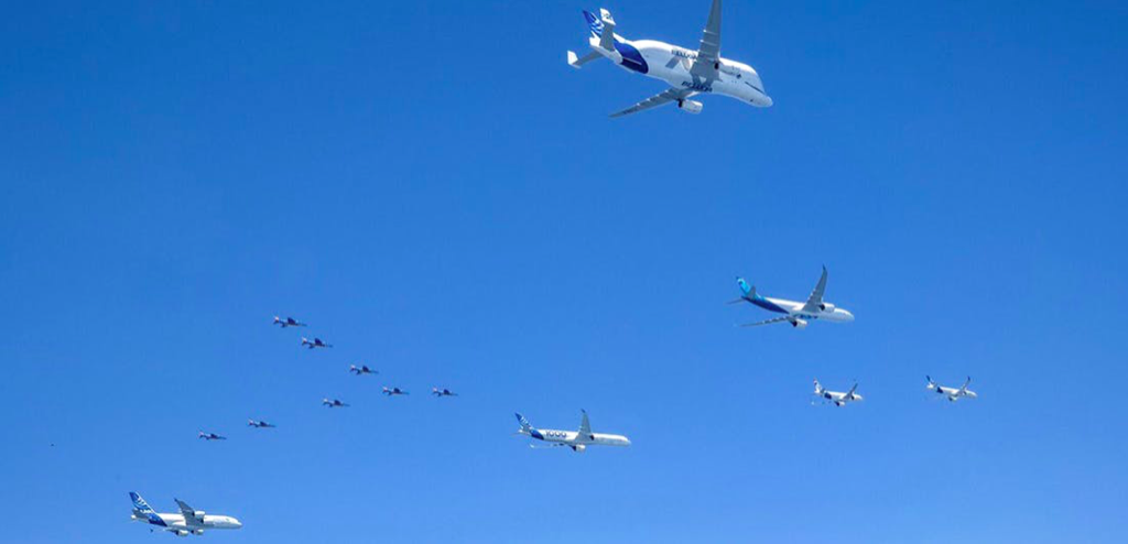 Beeindruckende Zahlen, die man natürlich gebührend feiern sollte. Und genau das hat Airbus in Toulouse vor wenigen Tagen gemacht. Mit sechs Flugzeugen, den A220, A320, A330 Neo, A350, A380 und Beluga XL, wurde eine beeindruckende Formation gebildet.