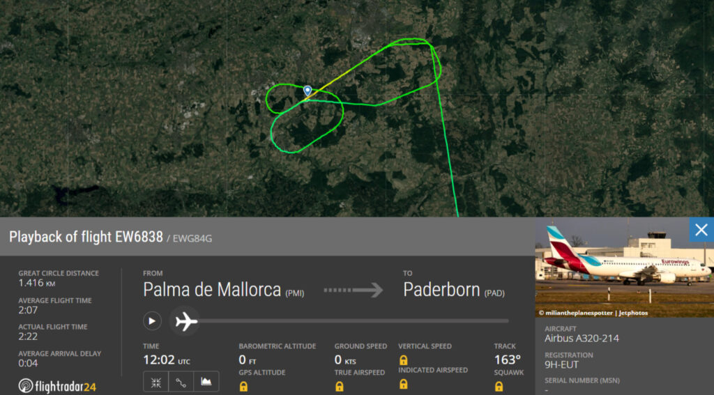 Eurowings-Flug EW6838 stieg zunächst wieder auf 3.000 Fuß (knapp 1.000 Meter), flog eine Kurve und anschließend auf 5.000 Fuß über die Startbahn des Flughafens von Paderborn. Etwa 15 Minuten nach der missglückten Landung führte die Crew einen weiteren Landeanflug durch. Unterdessen wartete bereits die Flughafenfeuerwehr auf den Airbus A320. Zum Glück ohne eingesetzt werden zu müssen, denn die Maschine landete sicher nach 2 Stunden und 22 Minuten Flugzeit.