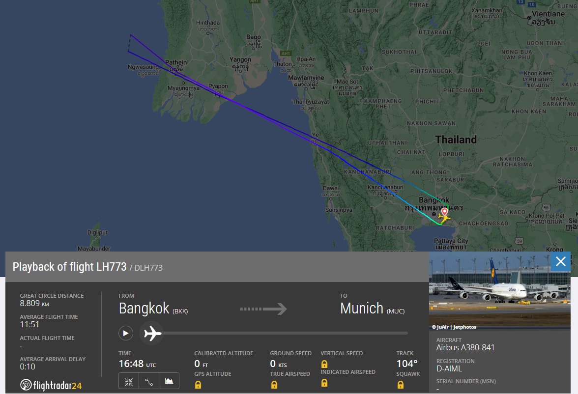 Was war passiert? Lufthansa führt einen täglichen Flug von Bangkok (BKK) nach München (MUC) durch. Typischerweise fliegt ein Airbus A380 die Strecke direkt in elf bis zwölf Stunden, um die Passagiere danach wohlbehalten in der bayrischen Landeshauptstadt abzusetzen.