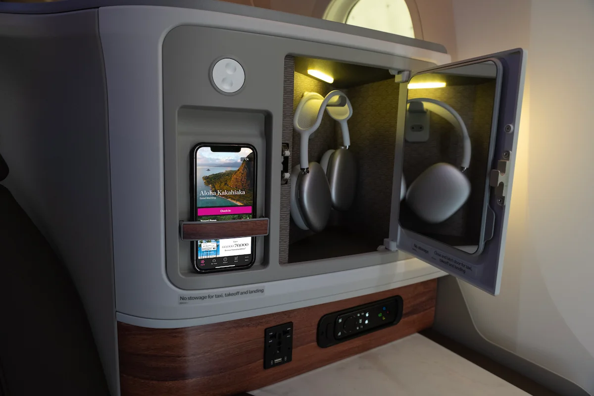 Alle Sitze haben einen 18″ Bildschirm, mehrere Strom- und USB Anschlüsse, sowie die Möglichkeit zum kabellosen Laden. Ob man wirklich Apple AirPods Max als Kopfhörer bereitstellt, wie auf den Bildern gezeigt, darf man abwarten. Hawaiian Airlines wäre hier aber meines Wissens die erste Airline die dies tut.