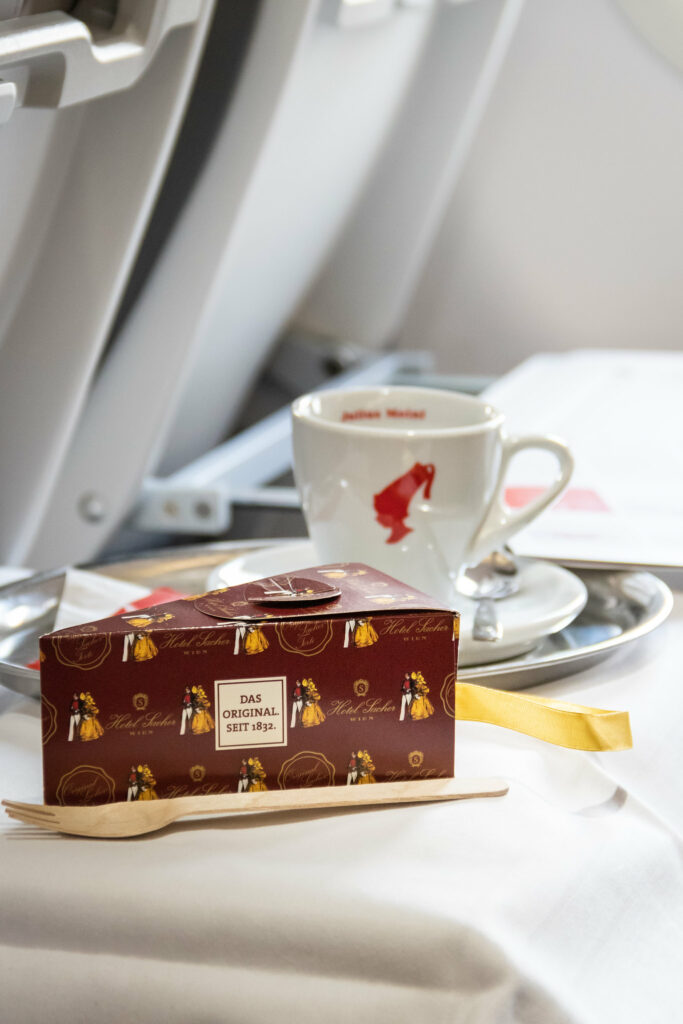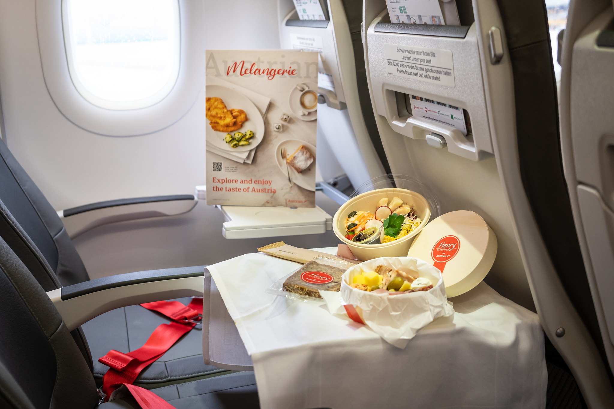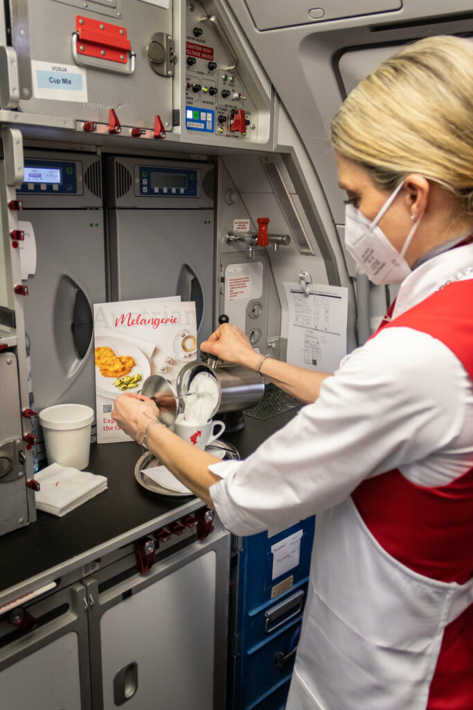 Die Melangerie ist auf Flügen bis zu 180 Minuten verfügbar, der Service in der Business Class bleibt unverändert. Zum Abschluss wird allen Fluggästen eine Schokolade gereicht. Auf eine kostenlose Wasserflasche wie es Lufthansa und Swiss auch künftig anbieten werden, wird bei der AUA verzichtet.