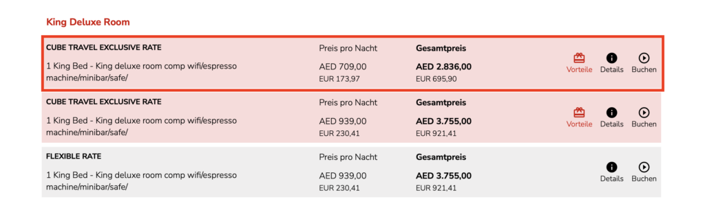 Hierbei werden Euch zwei Raten mit Frankfurtflyer Vorteilen angezeigt, die beide als „CUBE TRAVEL EXCLUSIVE RATE“ bezeichnet werden. Die günstigere der beiden (welche erst ab einer Buchung von min. 4 Nächten angezeigt wird), ist das hier beschriebene Angebot.