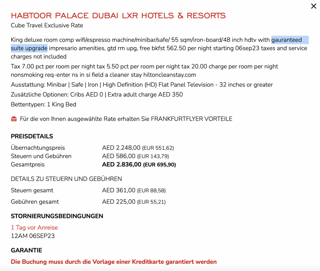 Wenn Ihr auf den Button mit „Details“ klickt, werden Euch auch noch einmal alle Details der Rate angezeigt. Hier sieht man dann auch, dass die Rate das Suite Upgrade garantiert!
