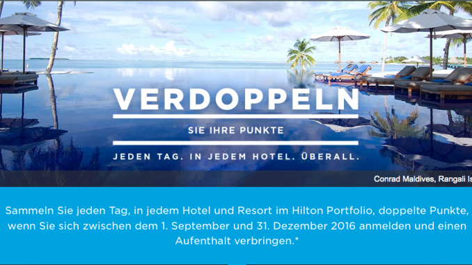 Im vierten Quartal 2016 ist Hilton allerdings nicht sehr kreativ, was die Promotion angeht. Es gibt doppelt Hilton Punkte für jeden Aufenthalt in einem Hotel der Hiltonkette zwischen dem 01. September und 31. Dezember 2016.