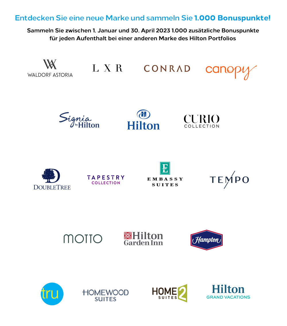 Und so scheinen doppelte Punkte derzeit ein beliebtes Konzept bei Hilton zu sein. Denn auch zum Anfang des Jahres 2023 gibt es wieder 100% Bonuspunkte auf alle normalen anrechnungsfähigen Punkte. Doch allein das wäre ja langweilig und so könnt Ihr zusätzlich 1.000 Punkte für jede Hotelmarke gutgeschrieben bekommen, die Ihr im Aktionszeitraum besucht.