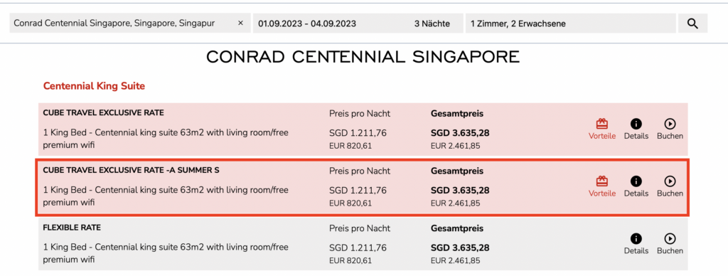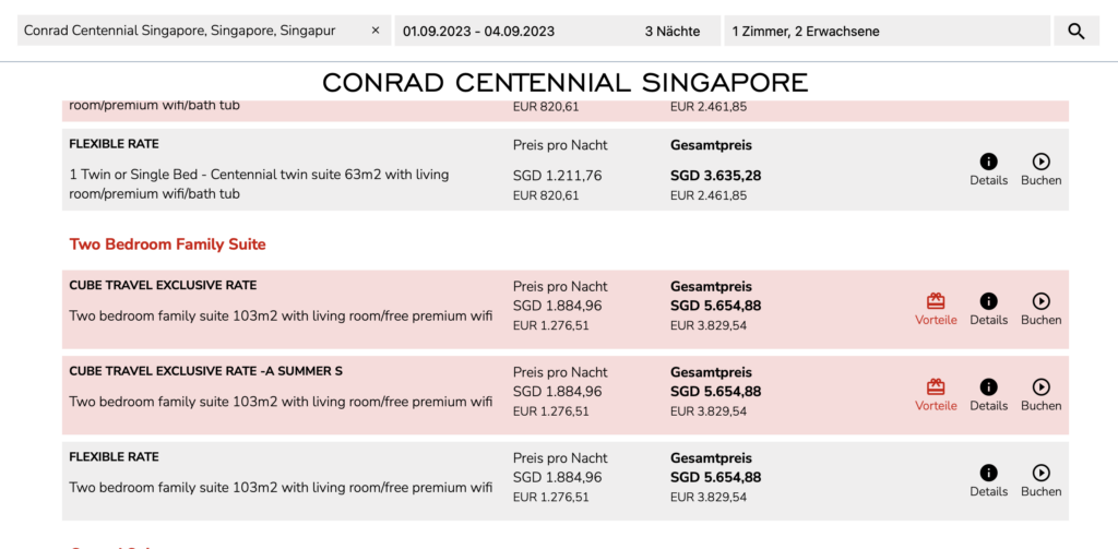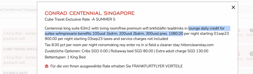 Hier ein Beispiel aus dem Conrad Centannial in Singapore für eine one Bedroom Suite. Man kann zwischen der „normalen“ Impresario Rate und dem aktuellen Suite Deal wählen, bei welchem man zum selben Preis alle Vorteile erhält, plus das extra Guthaben.