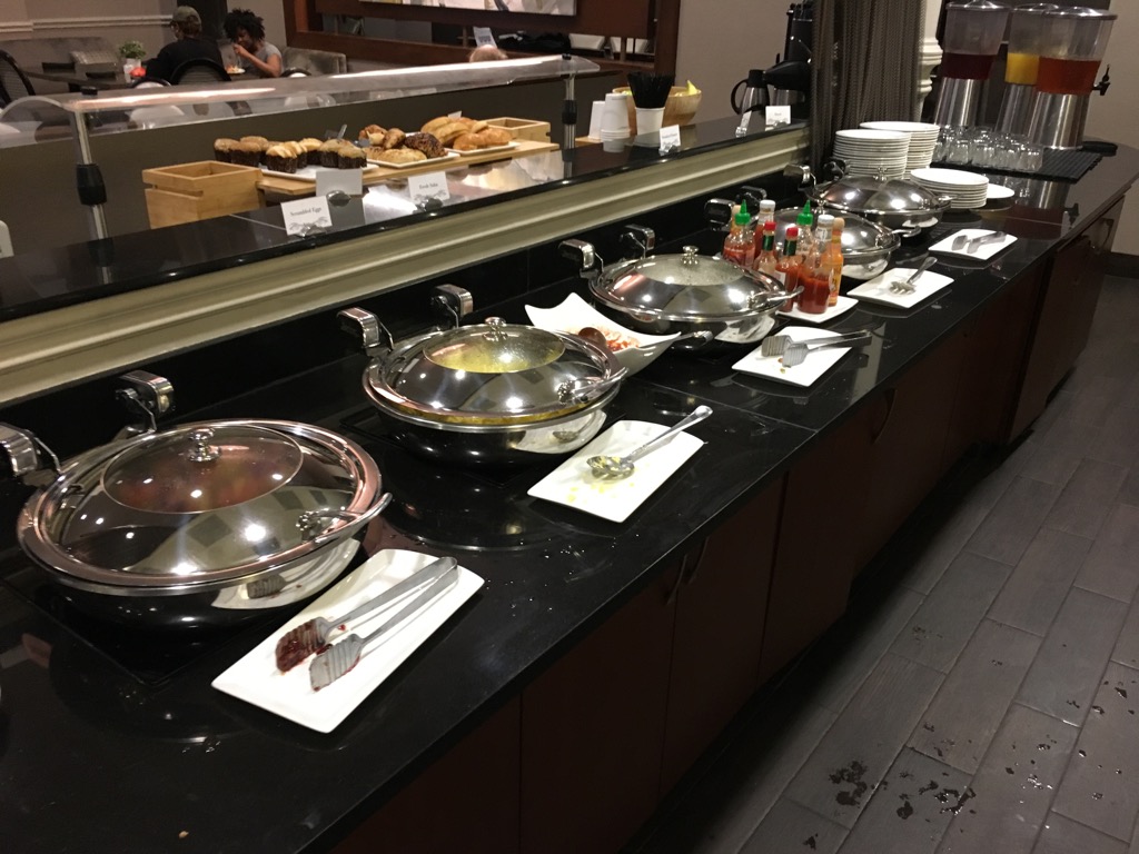 Die Auswahl auf dem Buffet entsprachen dem 20 US$ USA Buffet Frühstück. Neben Toast, Bagles, Müsli, süßen Teilchen und Obst, gab es auch warme Speisen wie Rührei, Würstchen, Frühstückskartoffeln, sowie Frenchtoast auf dem Buffet. An einer Omelett Station wurden von einem Koch auch frische Omeletts zubereitet.