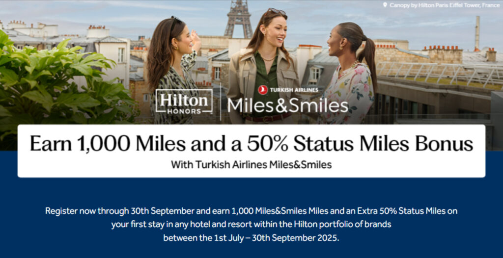 Gerade erst hat Turkish Airlines Miles & Smiles seine Mitglieder mit einer Mega-Promotion überrascht und kurz darauf mit einem Rückzieher enttäuscht. Die Chance auf eine Million Prämienmeilen mit Flügen zu sechs Kontinenten war dann wohl doch zu beliebt. Die Aktion wurde nur kurze Zeit nach dem Start zurückgezogen. Doch andere Aktionen zieht Turkish Airlines konsequent durch. So gab es zuletzt schon Extra-Statusmeilen mit Hotelbuchungen, Mietwagen und Einkäufen, wie diese Promo belegt. Die Möglichkeit mit Hotels extra zu punkten, wurde nun in Zusammenarbeit mit Hilton Honors erweitert. Bis Ende September 2025 könnt Ihr mit einem Aufenthalt 1.000 Prämienmeilen zusätzlich sammeln und erhaltet noch 50% Statusmeilen on top.