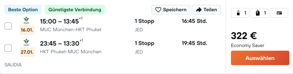 Die Flüge führen Euch immer über die Hubs in Jeddah oder Riad, wobei hier ein Transit problemlos und ohne Visum möglich ist. Wer über einen SkyTeam Status verfügt, darf sich bei Saudia auch über alle Vorteile des SkyTeam Elite oder Elite Plus Status freuen, was die Reise nach Thailand auch in der Economy Class sehr angenehm machen kann, gerade wenn man diesen Schnäppchenpreis sieht.
