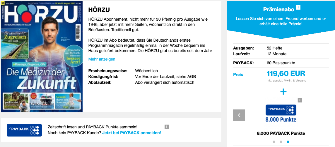 Gerade gibt es für die HÖRZU ein sehr gutes Angebot, denn man kann mit nur einem Abo 8.060 Miles&More Meilen für 119,60 Euro sammeln. Hierdurch entsteht eine gute Ratio von 14,83 Euro je 1.000 Meilen. Besonders da sich das Magazin durchaus zum Lesen lohnt, kann man hier zwei Fliegen mit einer Klappe schlagen.