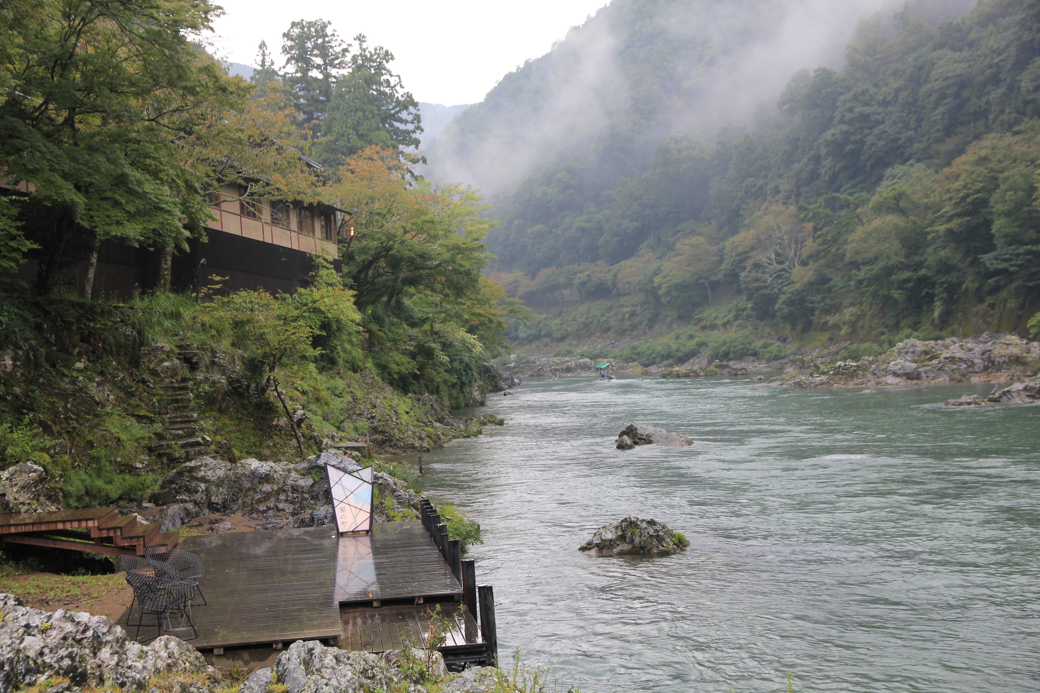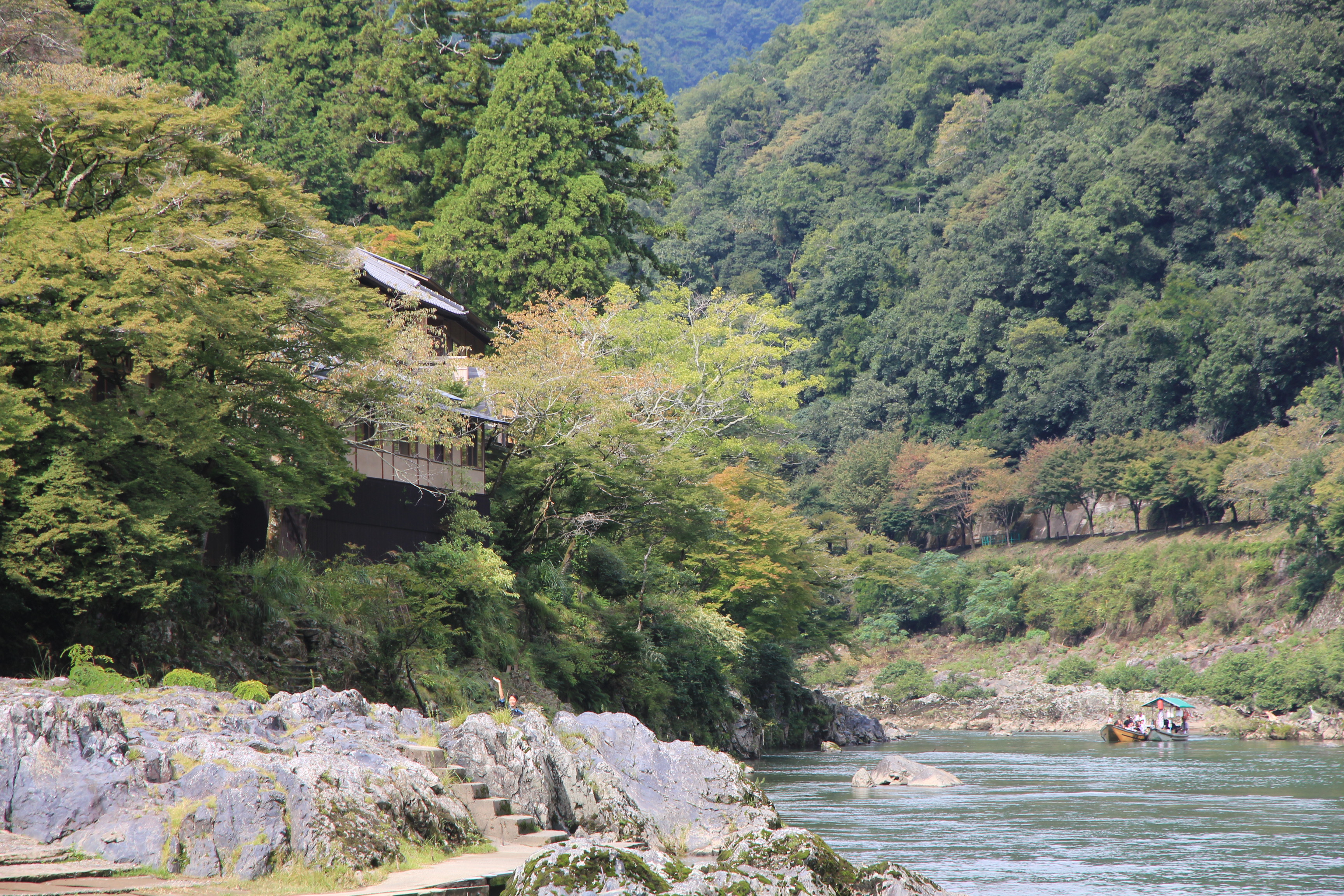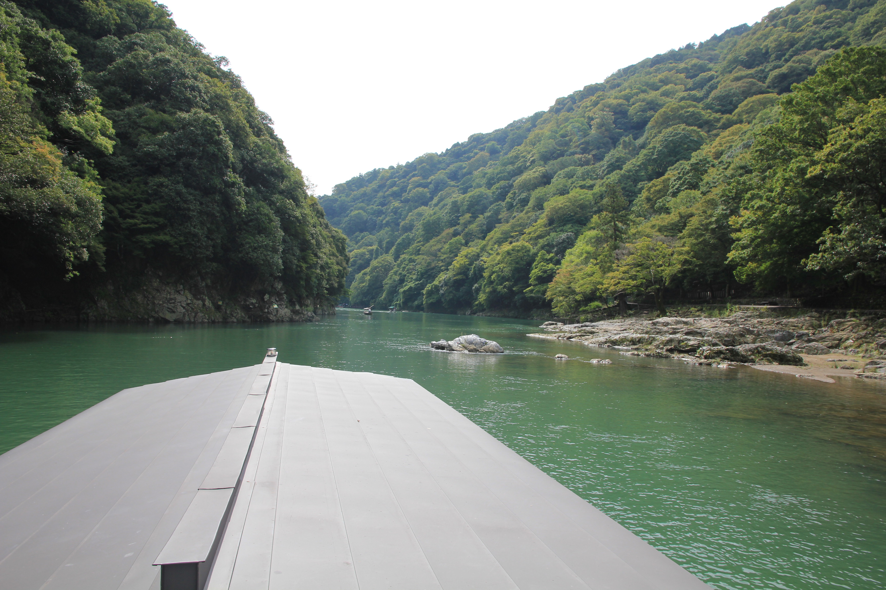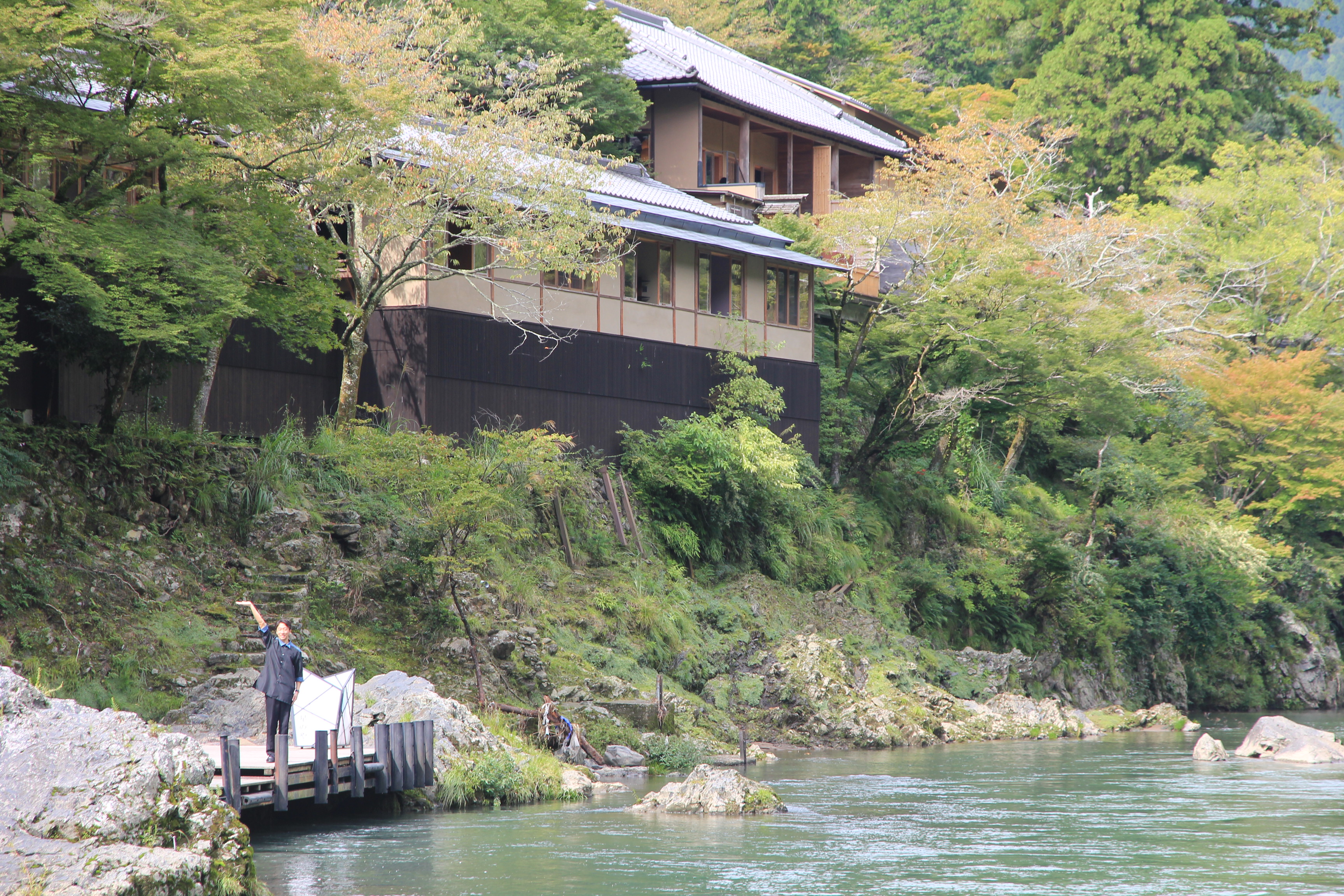 Nachdem ich am späten Vormittag ausgecheckt hatte, ging es für mich mit dem Shinkansen nach Kyoto. Für die gut 500 Kilometer braucht man mit dem japanischen Bullet Train nur gut 2 Stunden. Vom Bahnhof in Kyoto kann man entweder ein Taxi nehmen, das braucht dann knappe 30 Minuten, oder man fährt mit der Regionalbahn weiter. Letztere Option habe ich gewählt. Nach 10 Minuten Fußweg durch ein altes, historisches und entspanntes Viertel kam ich dann am Fluss an.  Hier befindet sich das „Wartezimmer“ vom HOSHINOYA Kyoto. Man checkt hier nämlich ein, bevor man mit dem hoteleigenen Boot flussaufwärts zum Hotel gefahren wird. Nach circa 15 Minuten und einer wunderschönen Tour durch ein kleines Tal kommt man am Bootssteg des Hotels an.