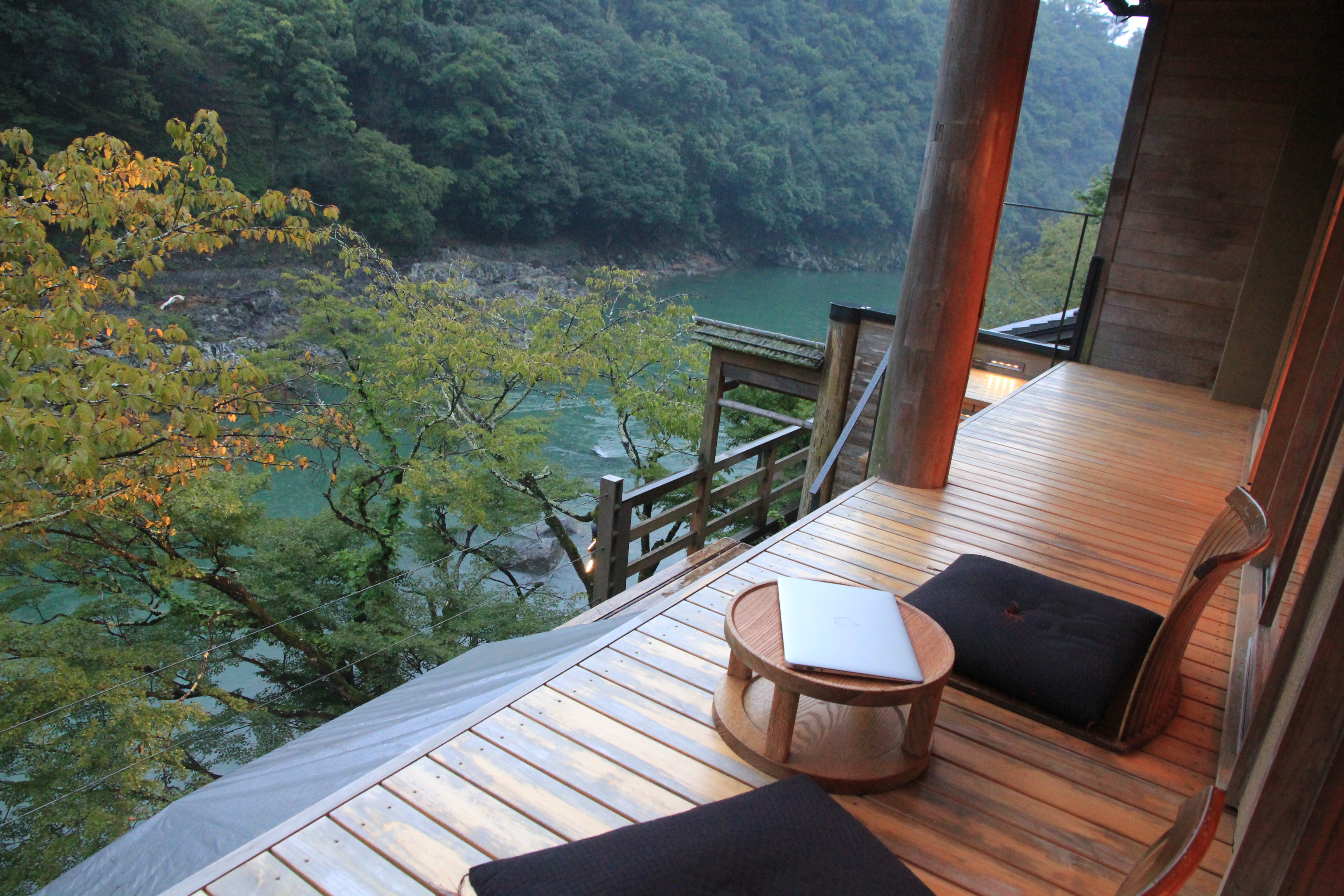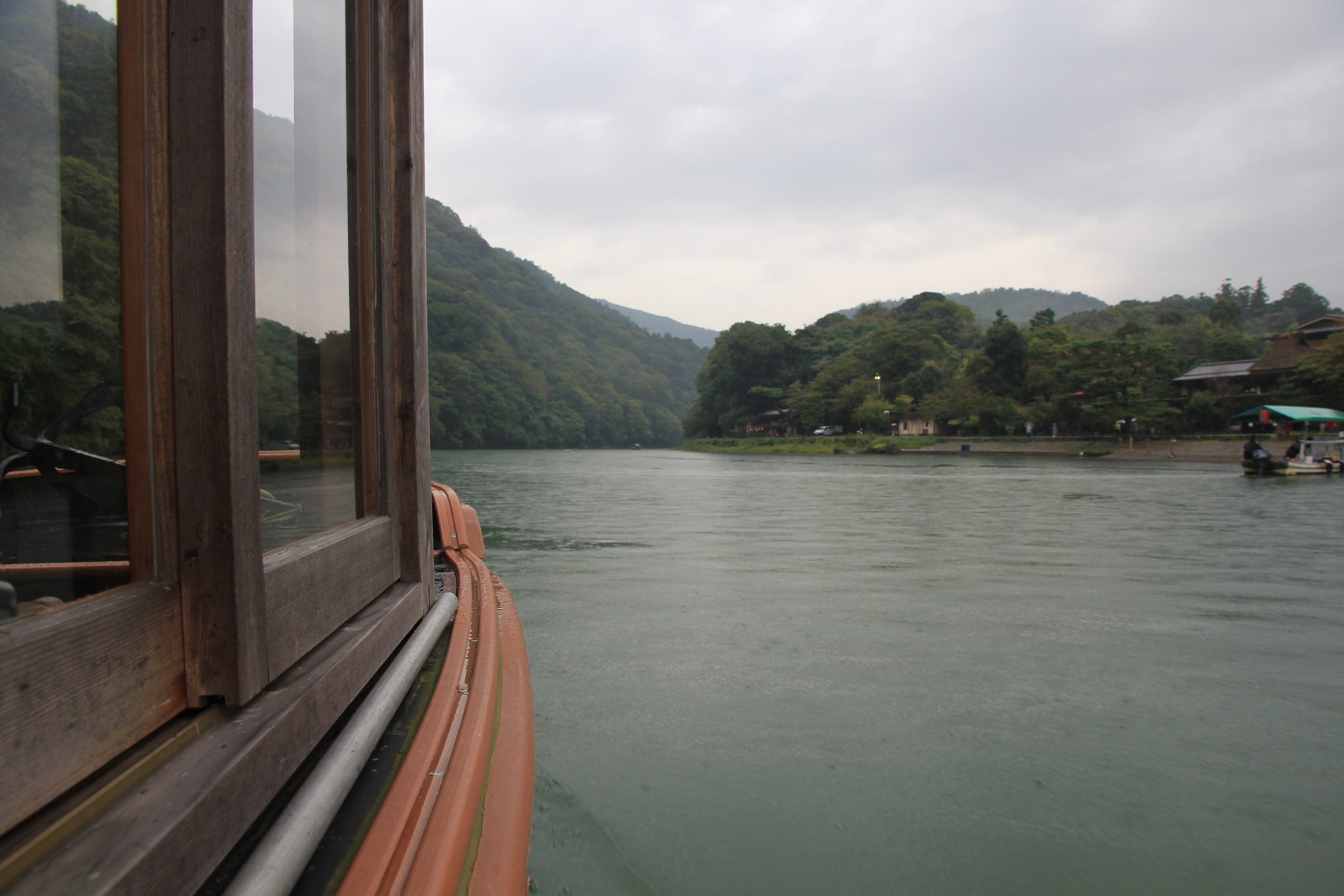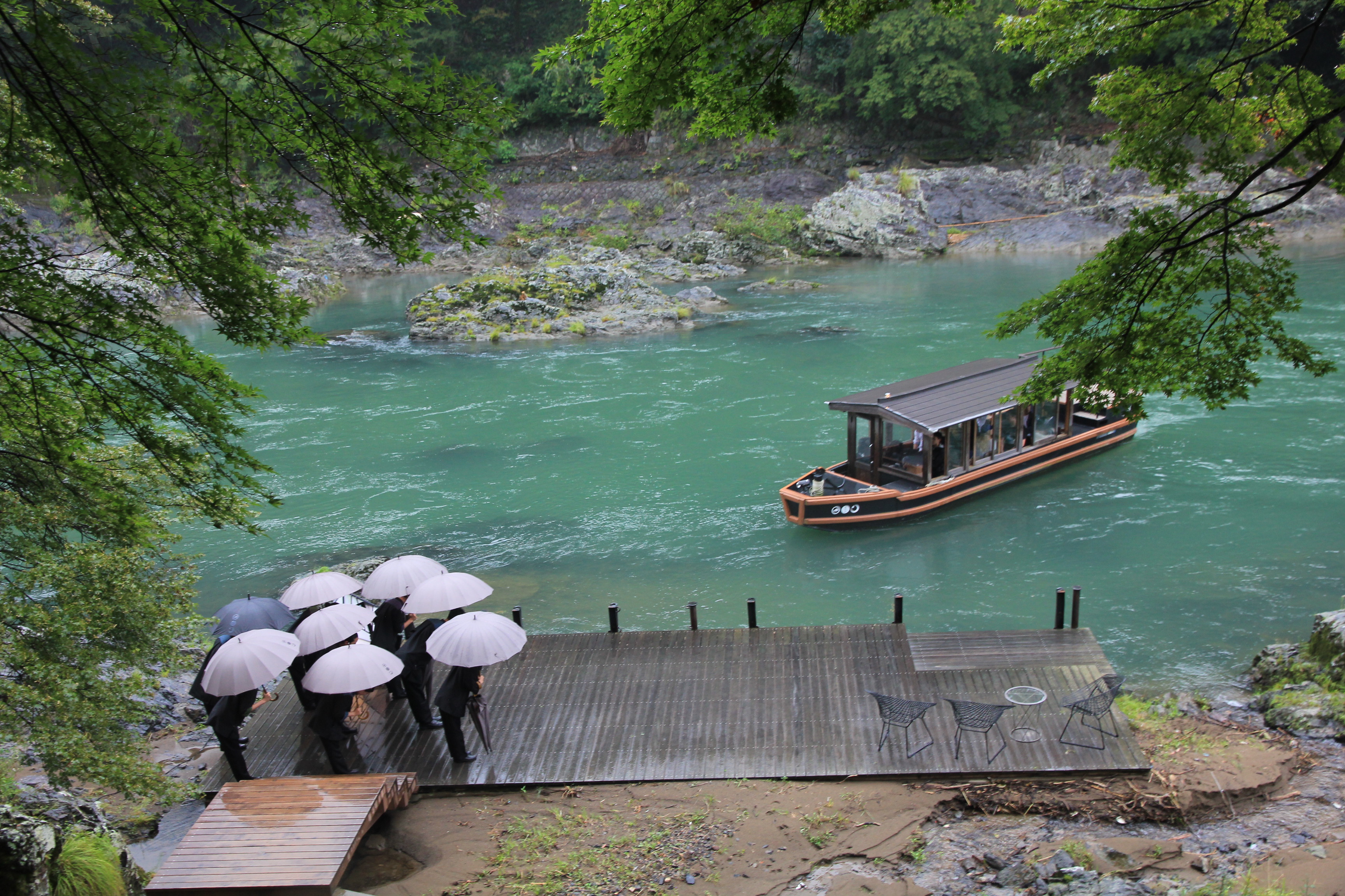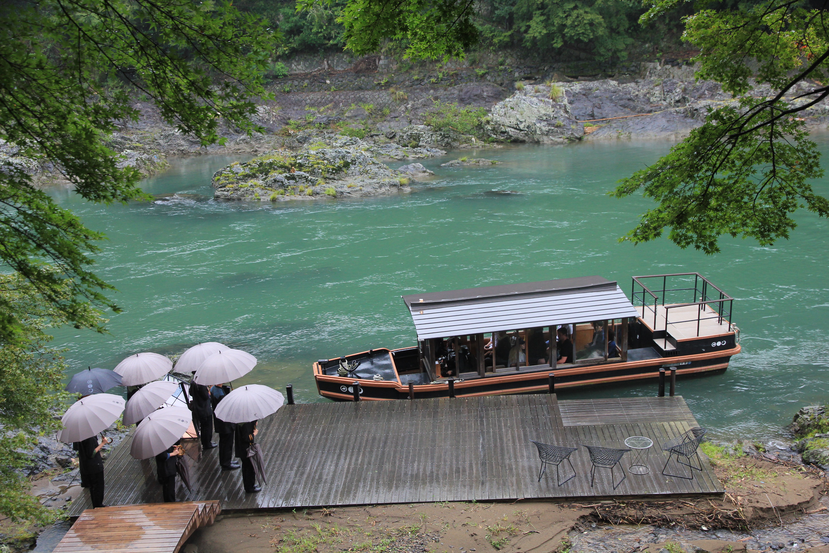 Nachdem ich am späten Vormittag ausgecheckt hatte, ging es für mich mit dem Shinkansen nach Kyoto. Für die gut 500 Kilometer braucht man mit dem japanischen Bullet Train nur gut 2 Stunden. Vom Bahnhof in Kyoto kann man entweder ein Taxi nehmen, das braucht dann knappe 30 Minuten, oder man fährt mit der Regionalbahn weiter. Letztere Option habe ich gewählt. Nach 10 Minuten Fußweg durch ein altes, historisches und entspanntes Viertel kam ich dann am Fluss an.  Hier befindet sich das „Wartezimmer“ vom HOSHINOYA Kyoto. Man checkt hier nämlich ein, bevor man mit dem hoteleigenen Boot flussaufwärts zum Hotel gefahren wird. Nach circa 15 Minuten und einer wunderschönen Tour durch ein kleines Tal kommt man am Bootssteg des Hotels an.