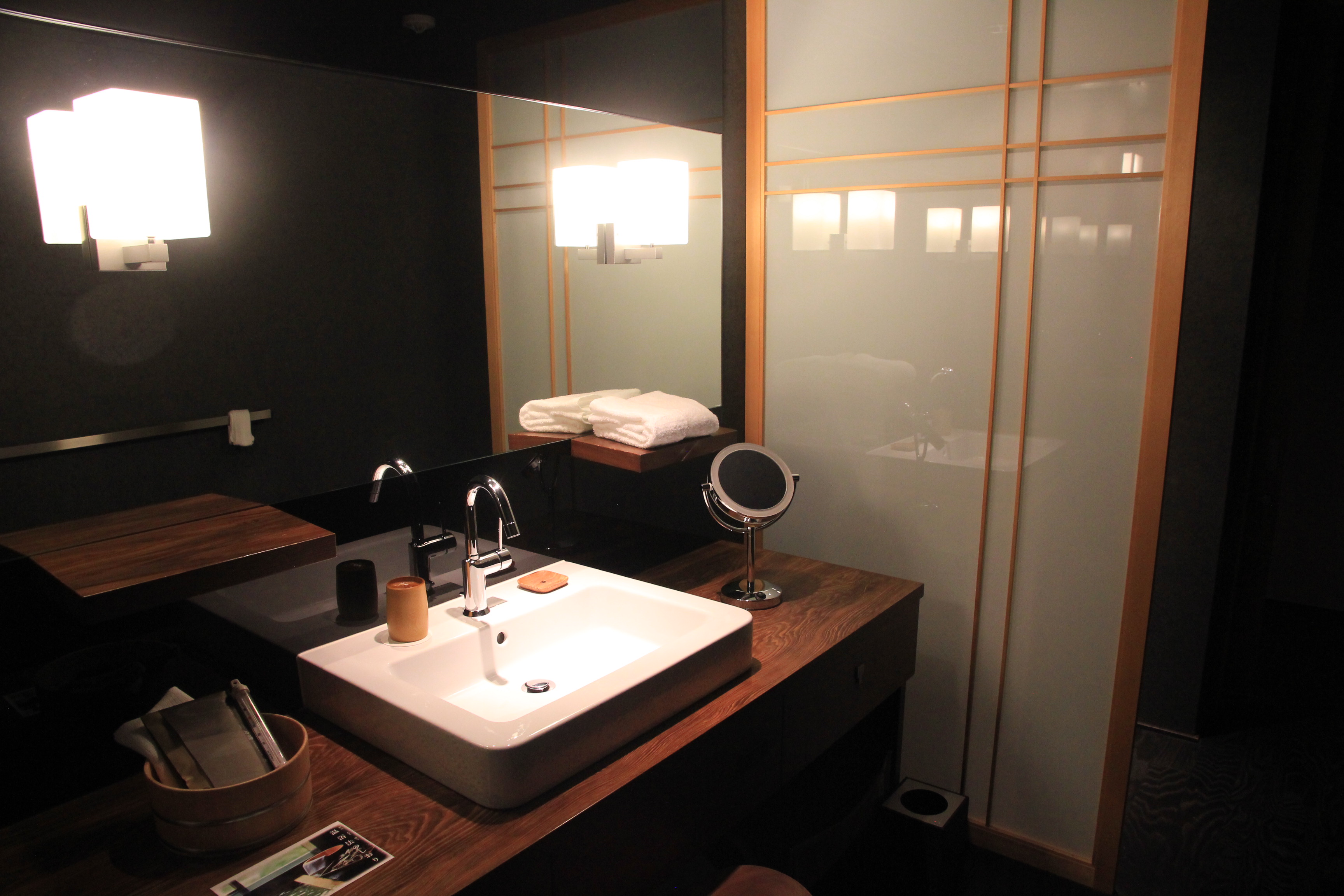 Die Dusche ist durch eine Glaswand vom Bad abgetrennt. Hier befindet sich ähnlich wie in einem Onsen eine Badewanne aus Holz, sowie die üblichen kleinen Hocker, auf die man sich beim Waschen setzt. Aus diesem Grund waren auch die Amaturen sehr niedrig angebracht.