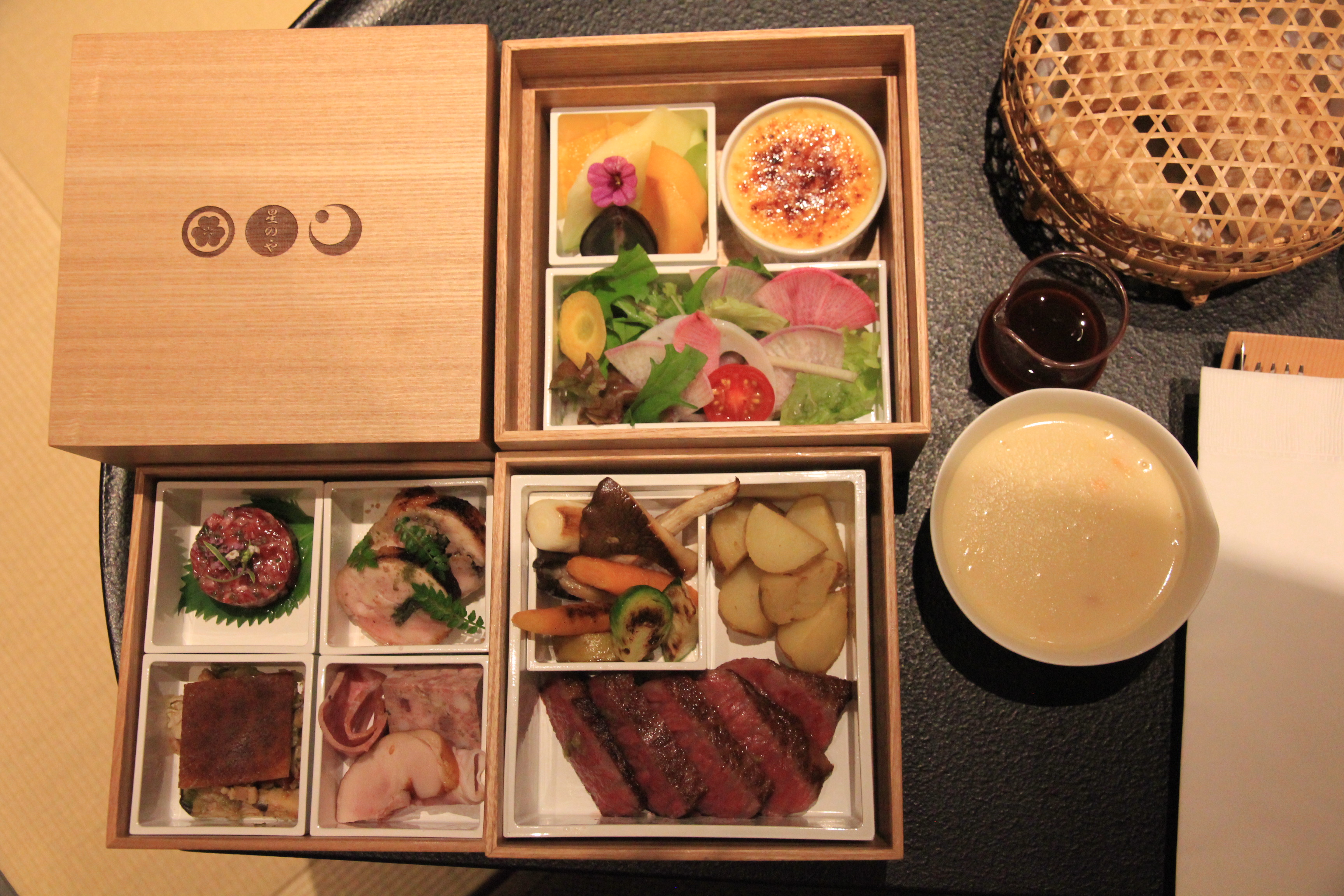 Am ersten Abend habe ich auf dem Zimmer eine traditionelle Bento-Box bekommen. Diese besteht aus vielen verschiedenen Gerichten. Neben Geflügel und Salat war das Menü recht fleischlastig. Für mich war es aber perfekt. Das Pferdefleisch-Tatar war ein Traum und auch das Rind war wirklich perfekt. Dank des hohen Fettanteils ist es sprichwörtlich auf der Zunge zergangen. Als Dessert gab es noch eine Creme Brullée, sowie einen kleinen Obstsalat.