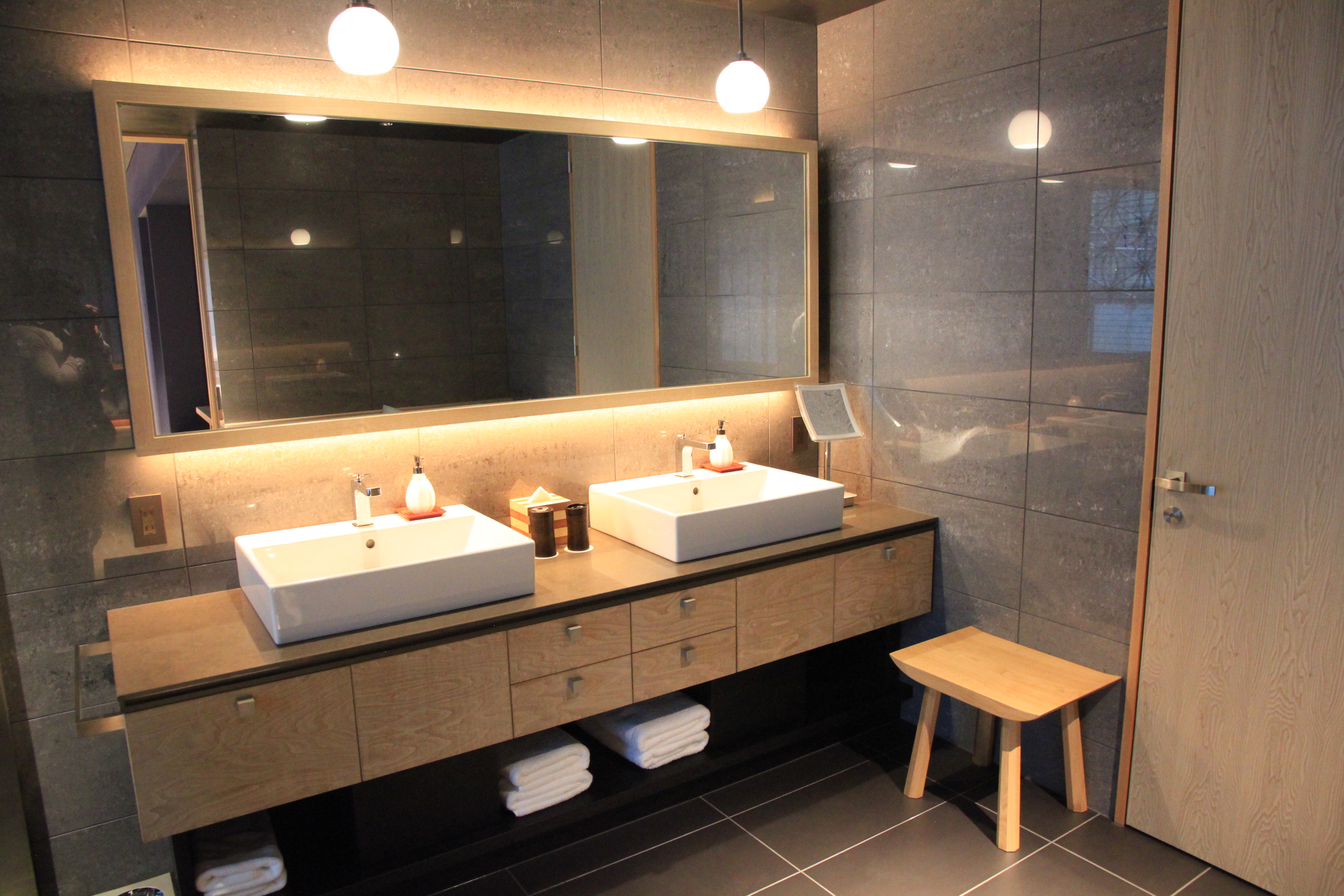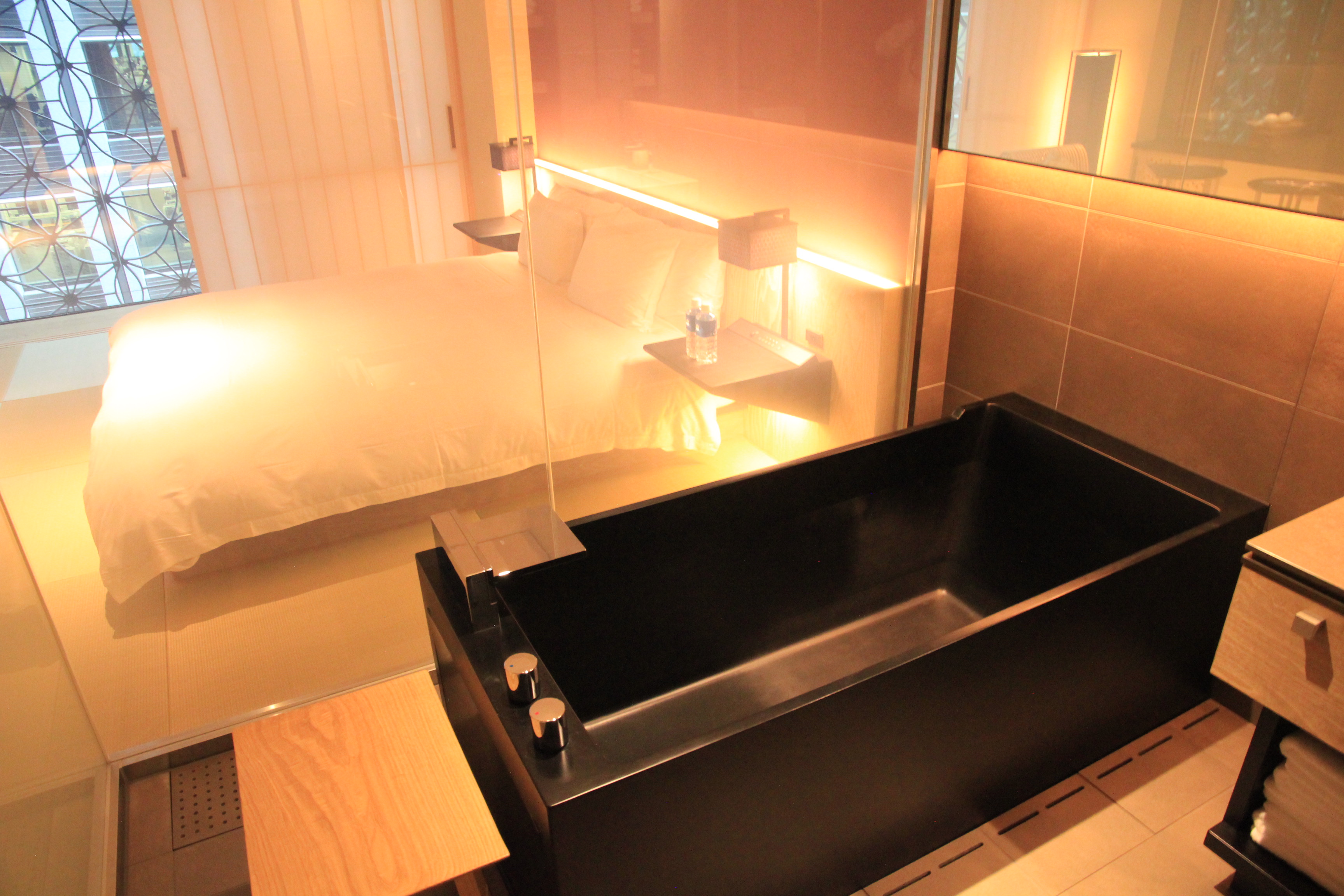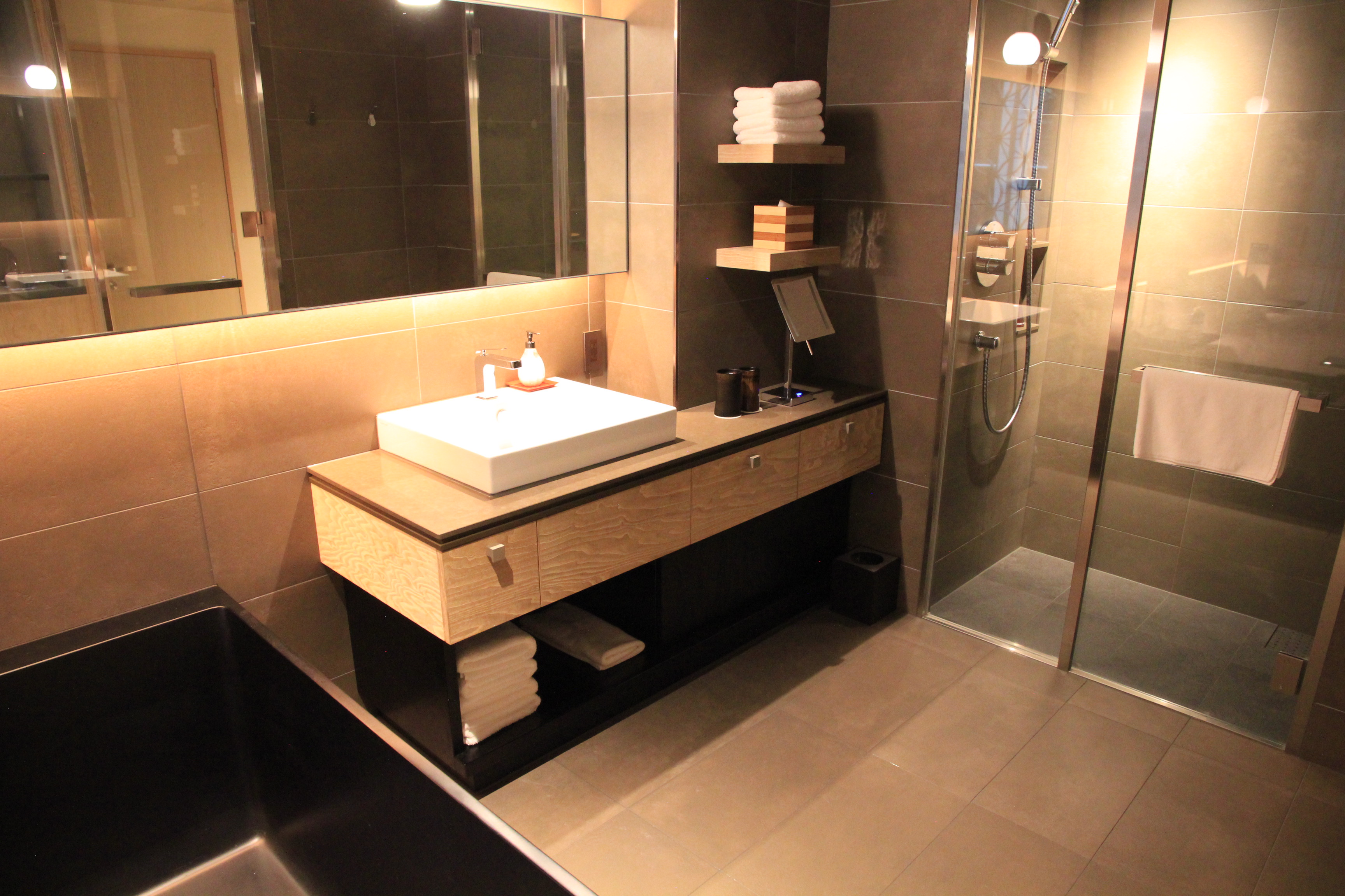 Das Bad befindet sich im Zimmer und ist durch eine Glaswand zum Schlafbereich abgetrennt. Allerdings lässt sich das Glas auf Knopfdruck in eine undurchsichtige Wand verwandeln. Im Bad befindet sich eine große Badewanne und ein Waschtisch mit einem einzelnen Waschbecken. Alle nötigen Amenities sind in den Schubladen verstaut.