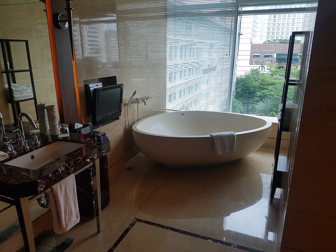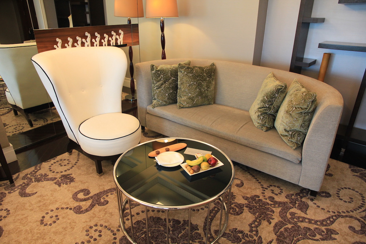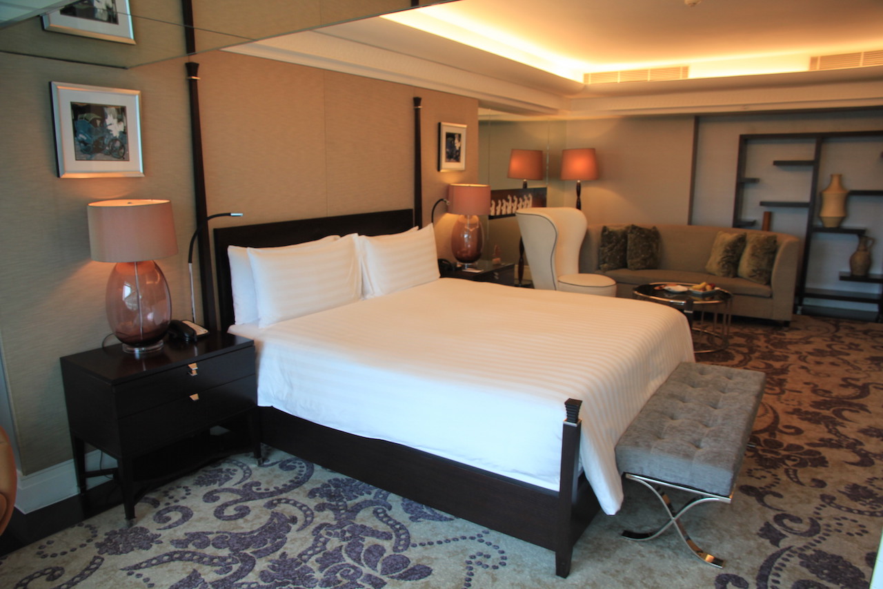 Wenn man das Hotel betritt, dann werden zuvor alle Koffer und Taschen gescannt. Vom Prozedere ist es mit einem Flughafen zu vergleichen. Auch die Wertsachen muss man kurz ablegen, wenn man durch den Scanner geht. In der Lobby angekommen habe ich an der Rezeption einige Augenblicke warten müssen, bis ich einchecken konnte. Nach wenigen Minuten hatte ich dann meine Zimmerkarte in der Hand. Ich wurde von einer der netten Damen nach oben zu meinem Zimmer begleitet. Ich bewohnte für meinen Aufenthalt einen 66 Quadratmeter großen Grand Deluxe King Room mit Zutritt zur Clublounge.