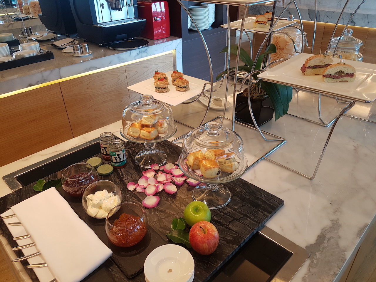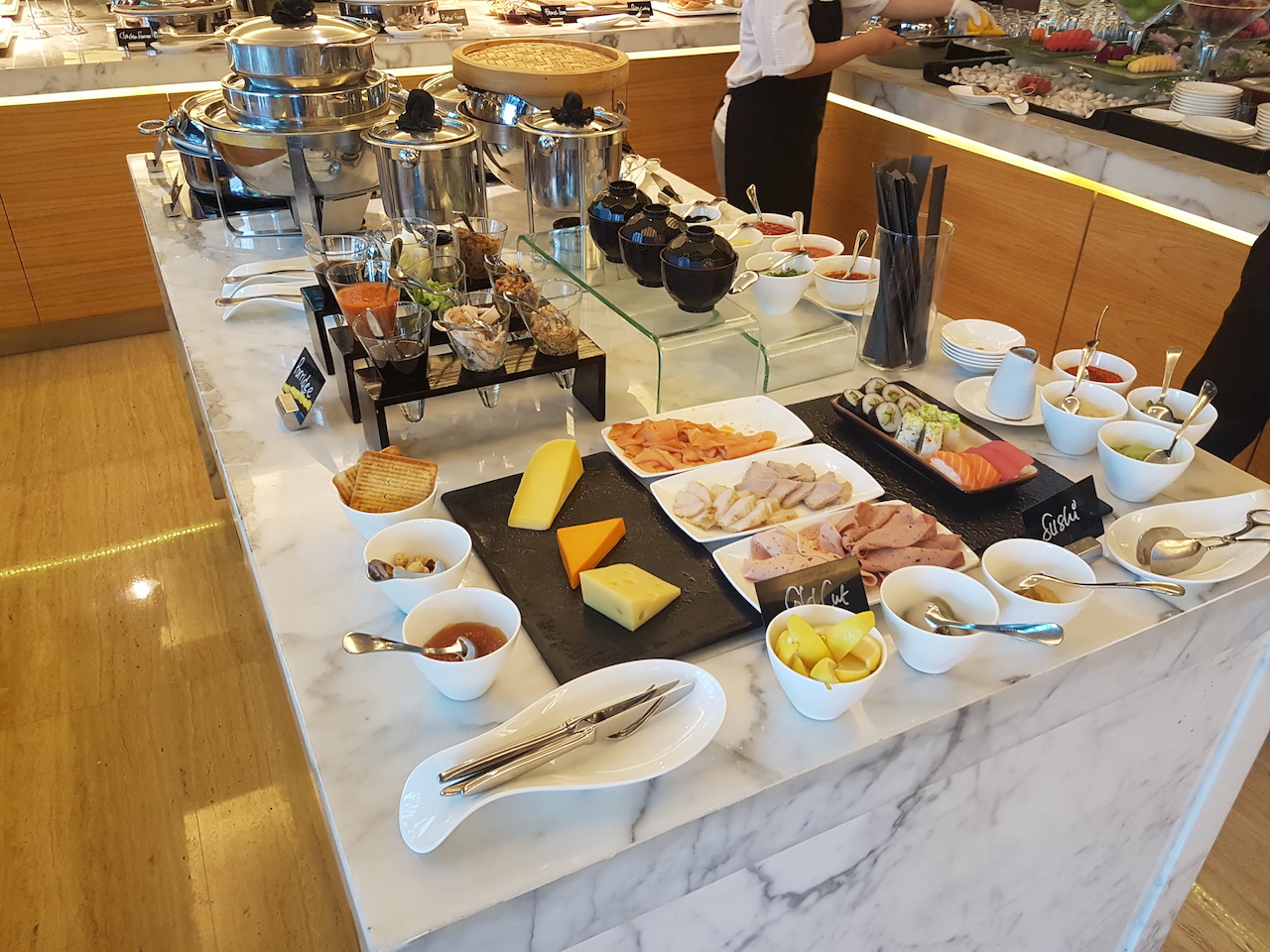 Am Morgen ist die Auswahl in der Clublounge größer, als in so manch anderem Hotel. Neben kalten Speisen wie Brot, Brötchen und süßen Teilen gibt es auch warme westliche und asiatische Gerichte.