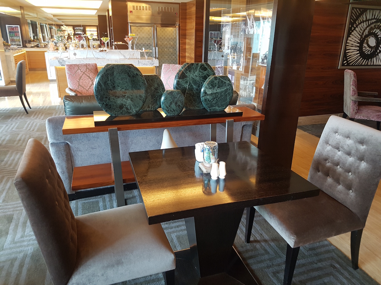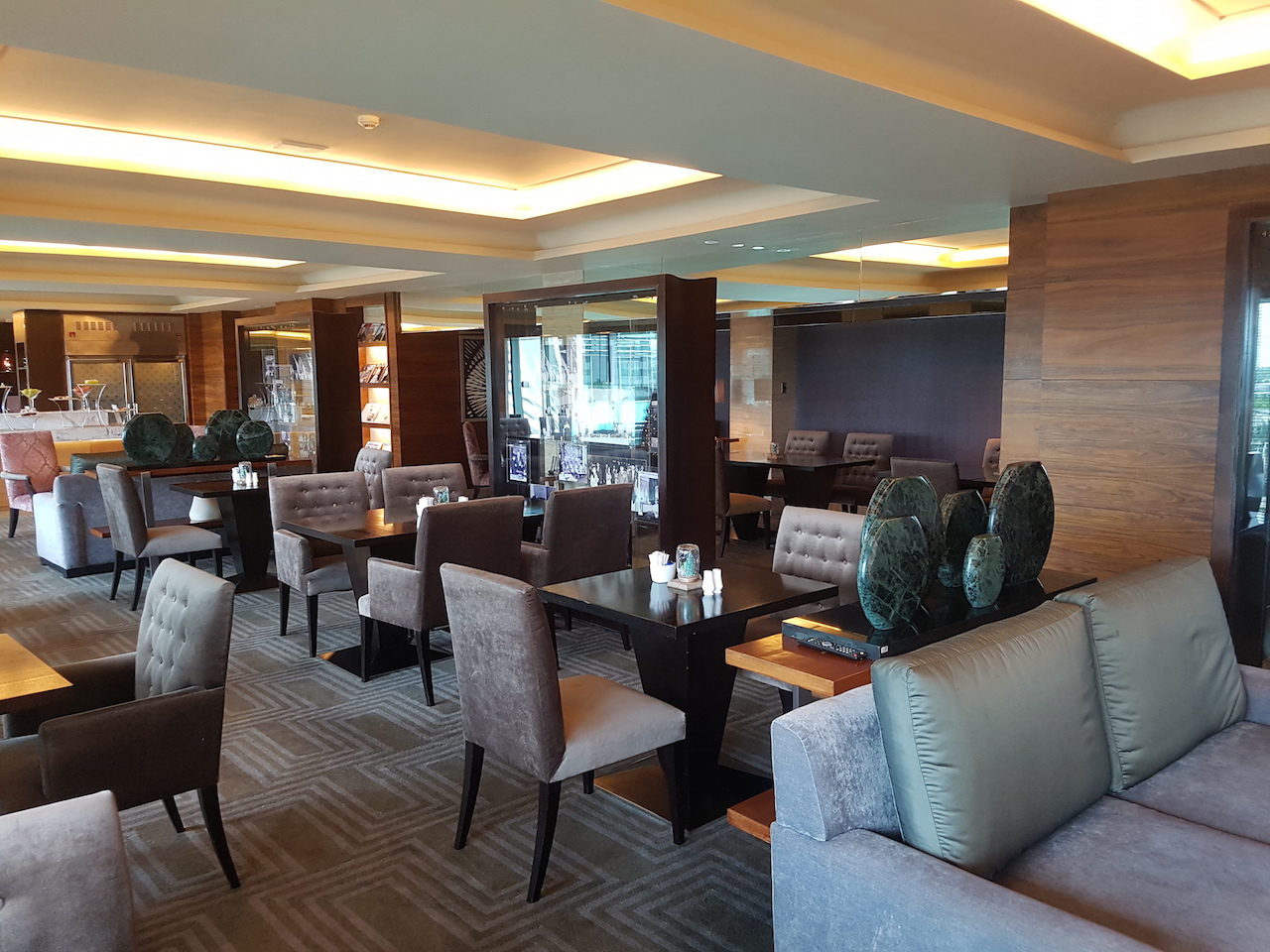 Die Clublounge ist ziemlich groß und ich habe sie zu keinem Augenblick als zu voll erlebt. Neben diversen Tischen entlang der Fensterfront, gibt es auch mehrere Sessel und Couhgarnituren. Super ist auch, dass im Boden an fast jedem Platz Steckdosen eingelassen sind. Hier kann man also überall problemlos am Laptop arbeiten.
