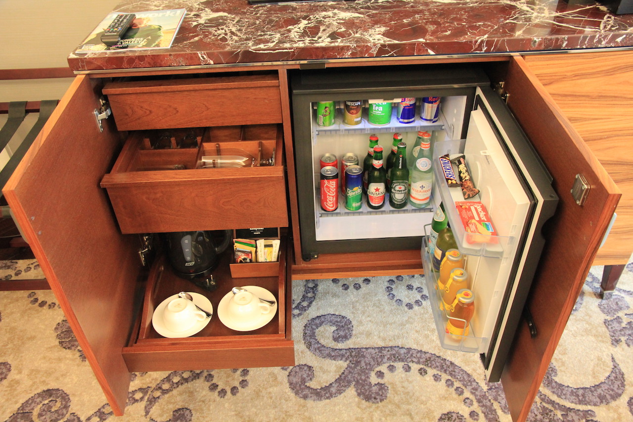 Links steht eine Kommode mit Fernseher und einer gut ausgestatteten Minibar.