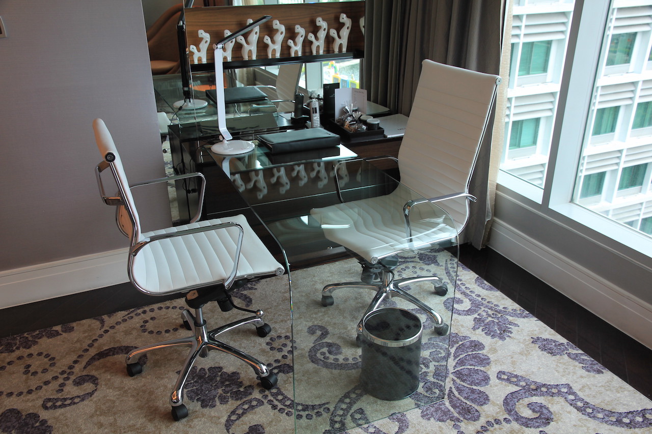 Auf der anderen Seite befindet sich ein Schreibtisch aus Glas mit zwei Stühlen. Direkt daneben befinden sich mehrere lokale und internationale Steckdosen.