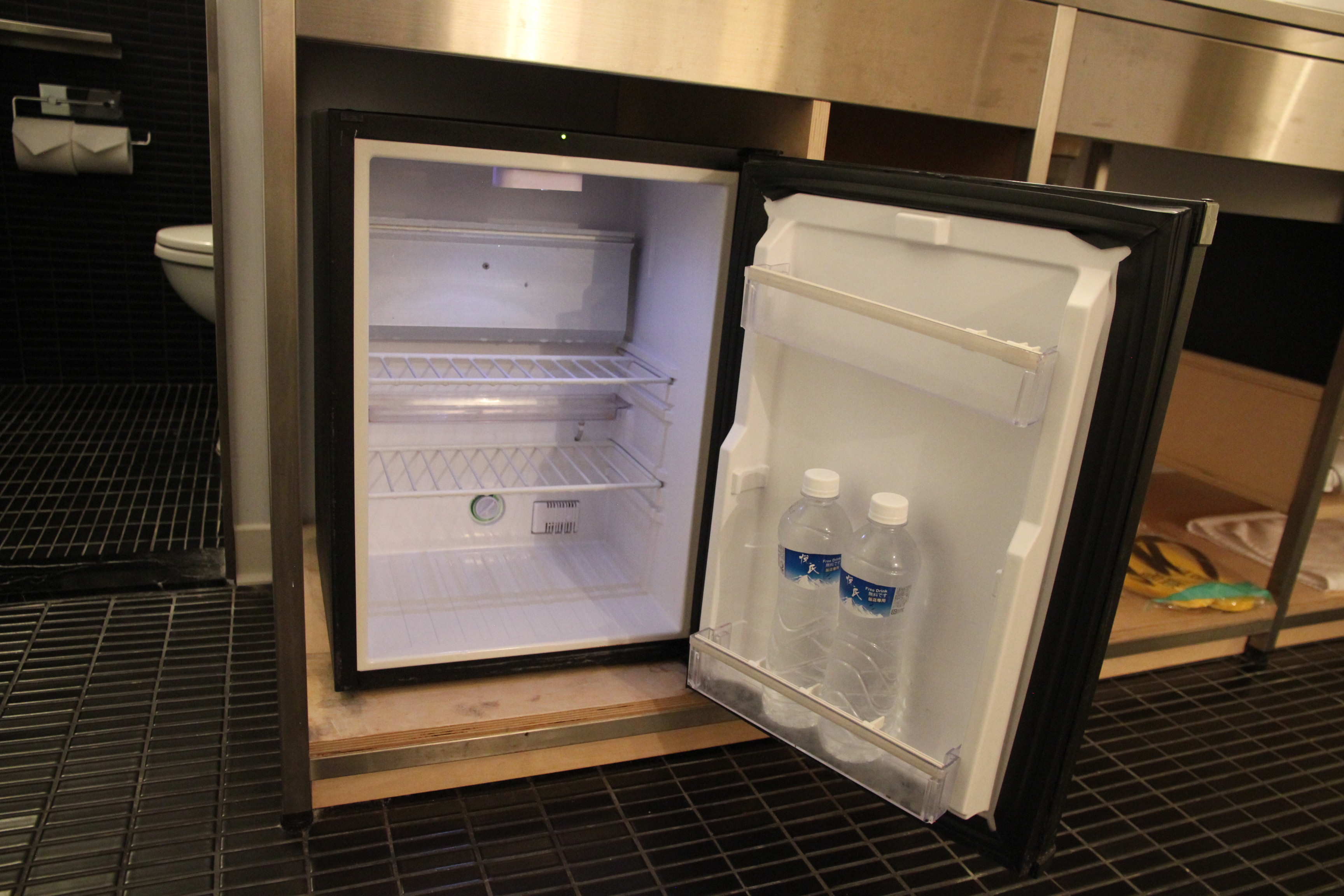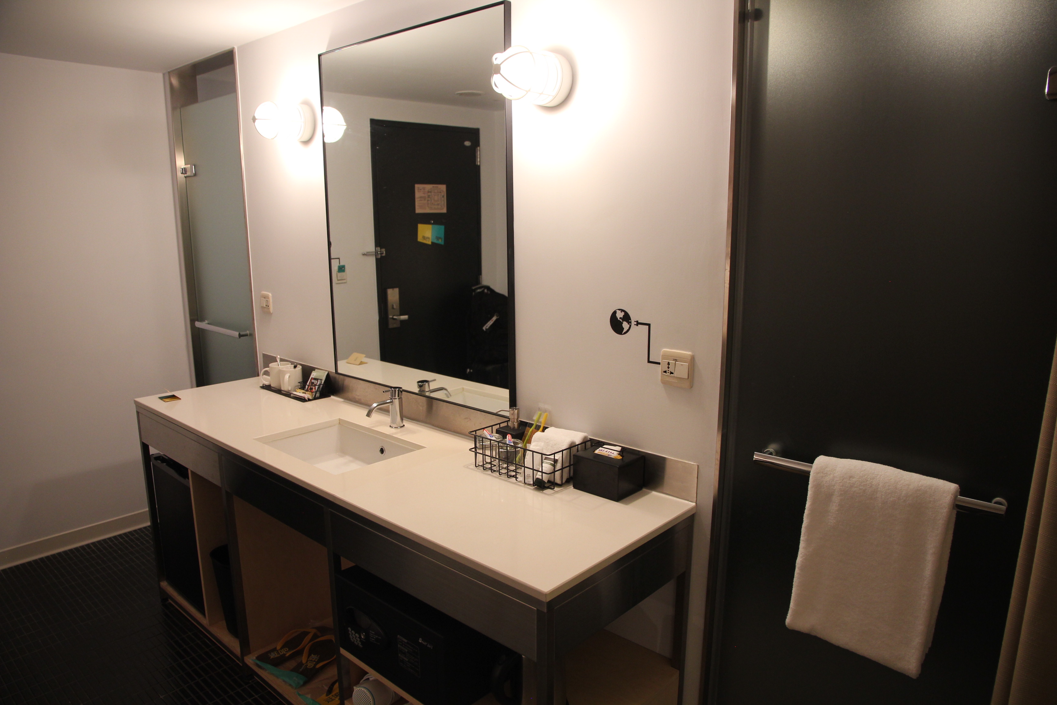 Als ich das Zimmer betrat fiel mir auf, dass der Eingangsbereich ungewöhnlich ist. Auf der rechten Seite befand sich ein Tisch und ein Kleiderschrank. Links befand sich jedoch ein Waschbecken, welches in eine große Ablagefläche integriert war. Darunter befand sich neben dem Kühlschrank auch noch der Safe.