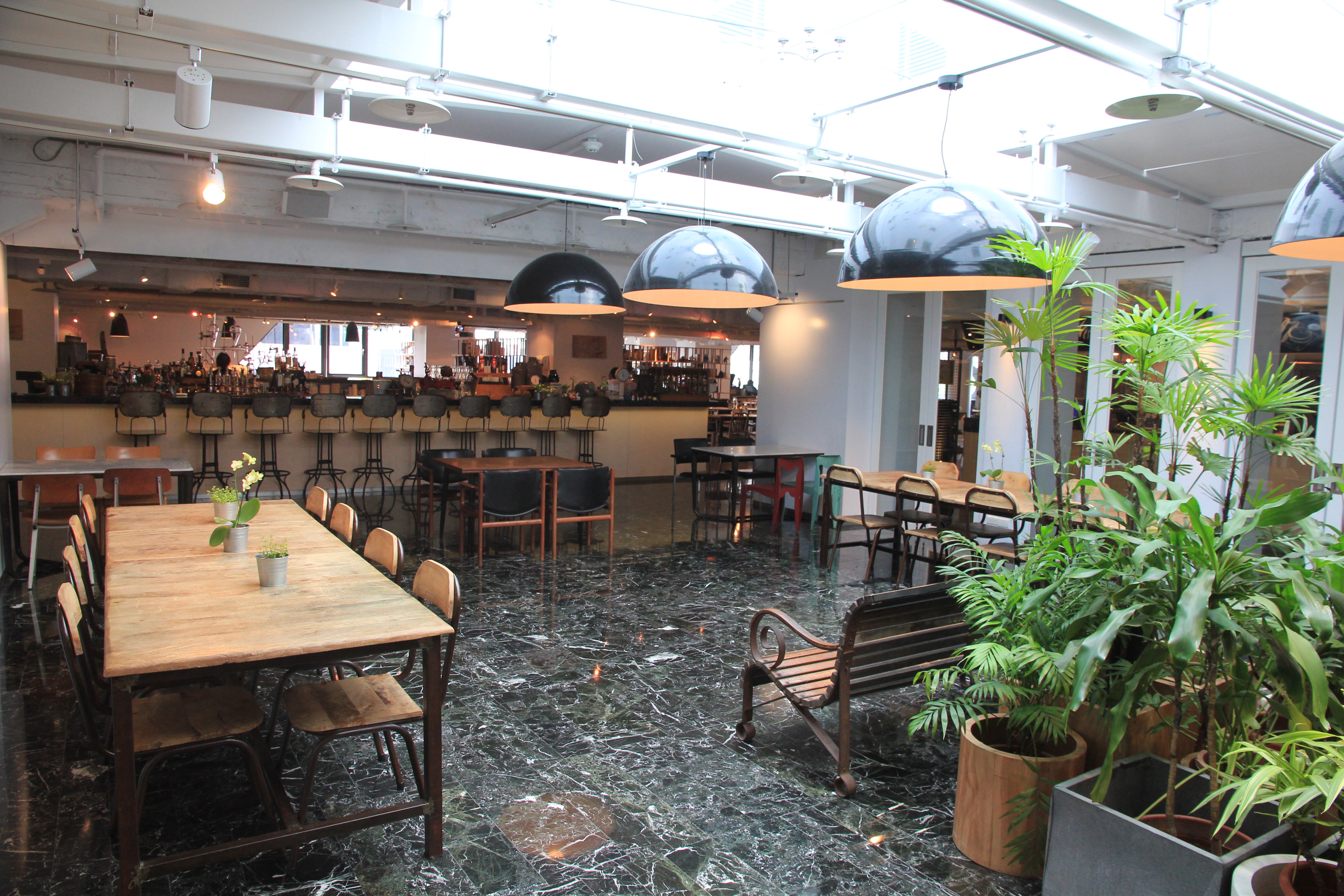 In der Mitte des Raumes befinden sich noch einige Pflanzen, die als Raumtrenner fungieren. Das Foyer verfügt über eine Glasdecke. Durch das Tageslicht wirkt alles sehr hell und freundlich.