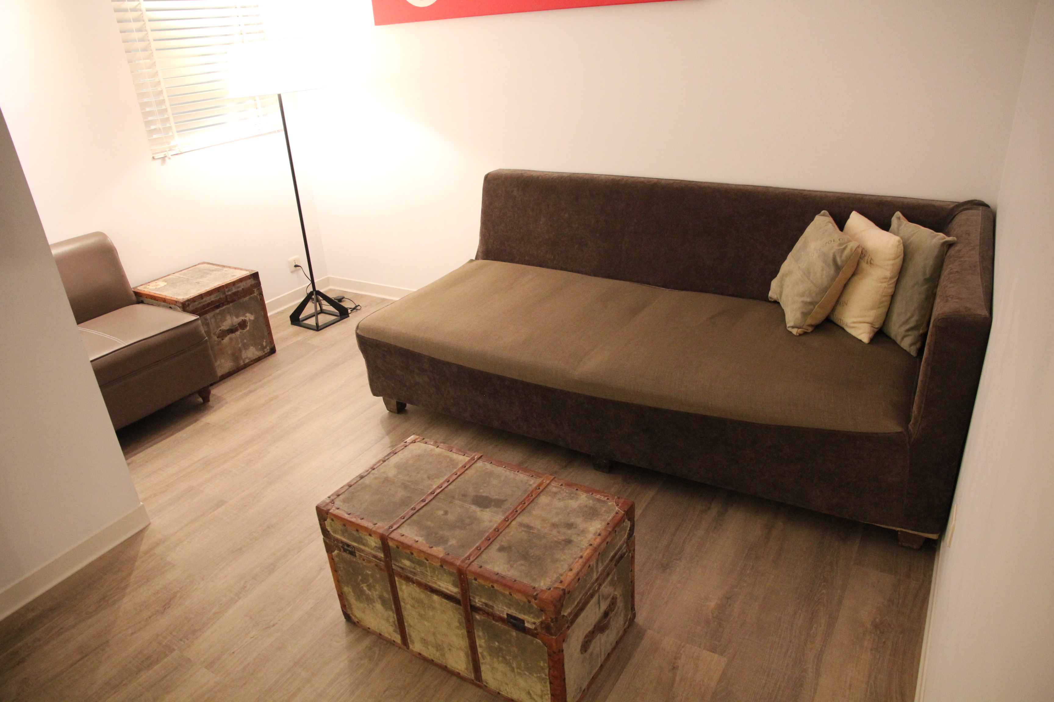 Auf der rechten Seite befand sich eine große Liegecouch. In der Ecke war ein Sessel, eine Lampe und ein Abstelltisch.