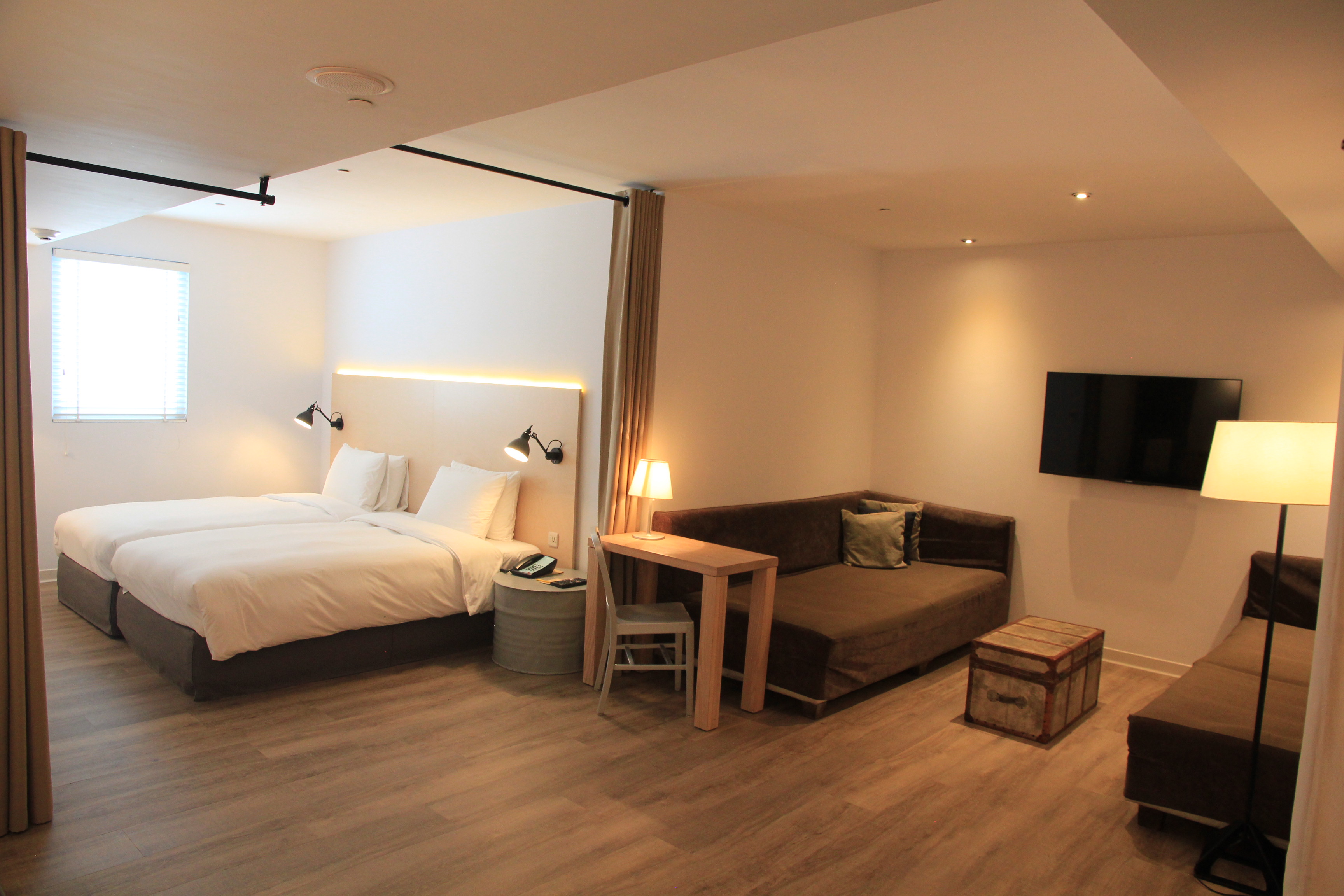 Das Familienzimmer ist von der Ausstattung identisch mit dem Zimmer welches ich bewohnt habe. Allerdings lässt sich der Sitzbereich durch den Vorhang abtrennen. Die Kinder haben dann auf der Schlafcouch quasi ihr eigenes Zimmer.