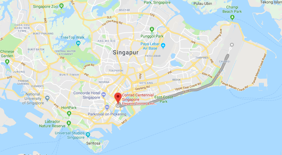 Vom Flughafen Changi braucht man mit dem Taxi gute 25 Minuten für die 18 Kilometer lange Strecke zum Hotel. Wir haben insgesamt 35 Singapore Dollar, oder umgerechnet 22 Euro führ die Fahrt bezahlt. Alle nächtlichen Zuschläge schon mit eingerechnet. Das Conrad Singapur liegt nur unweit der bekannten Marina Bay entfernt. Vom Hotel läuft man in 10 Minuten zum Marina Bay Hotel, der danebenliegenden Mall oder auch zu den Gardens by the bay. Wer dienstlich in der Stadt ist, der erreicht per Taxi so ziemlich jede Ecke des Geschäftsviertels innerhalb weniger Minuten.