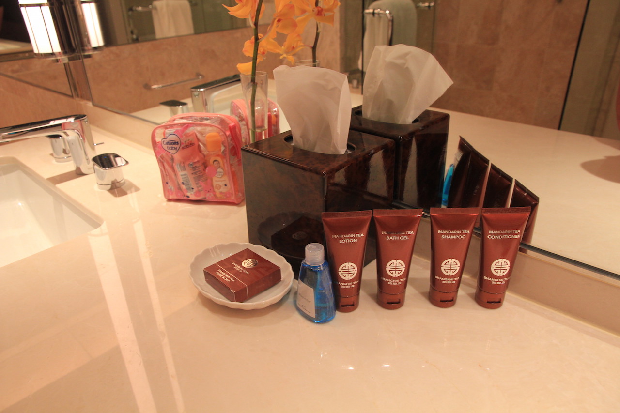 Auf der rechten Seite befindet sich ein großes Doppelwaschbecken mit genügend Ablagefläche. Die Pflegeprodukte stammen aus dem Hause Shanghai Tang. Was mir auch gefallen ist, war die Aufmerksamkeit zum Detail. Man hat uns sogar ein kleines Pflegeset für unseren Sohn hingestellt. Das habe ich bisher so nicht erlebt.