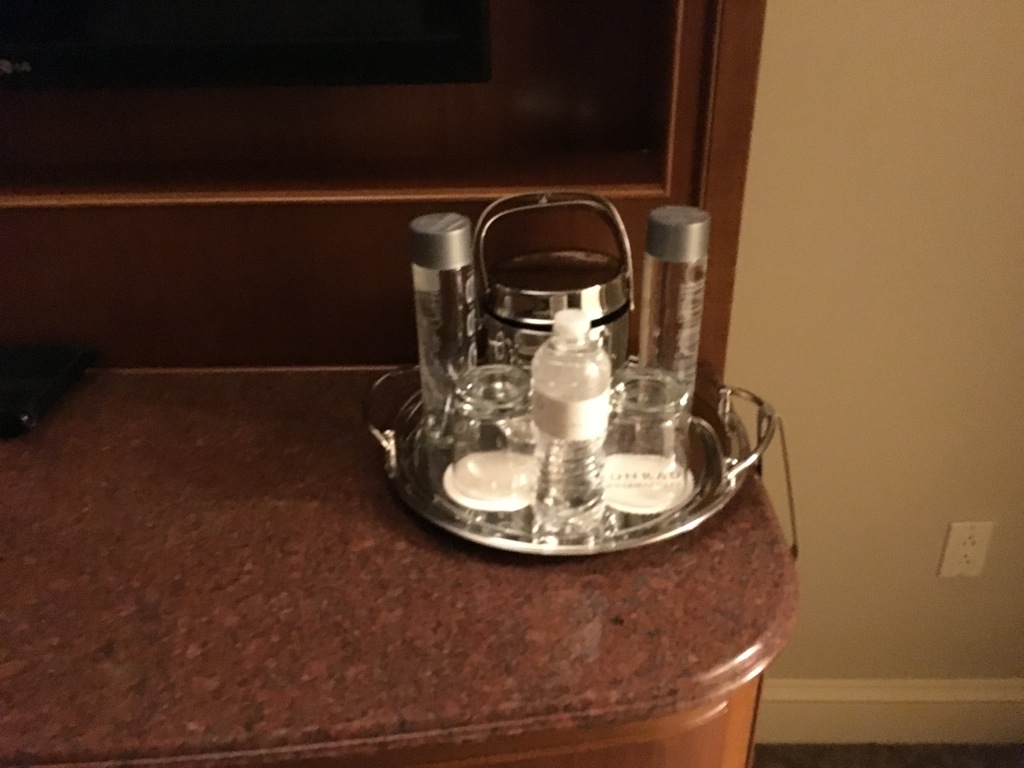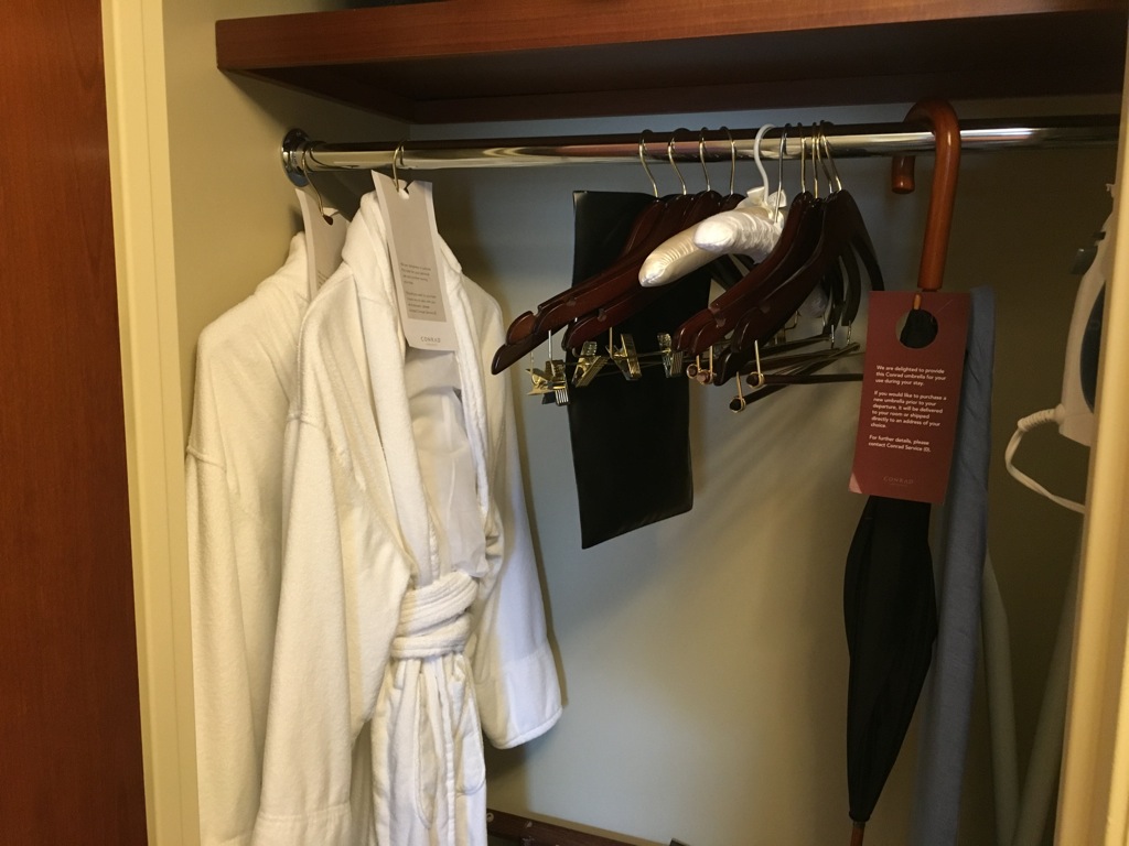 Im Kleiderschrank fand man auch noch ein Bügeleisen, Save, Bademäntel und den üblichen Conrad Regenschirm. Was mir im Zimmer leider fehlte waren Wasserflaschen für die Nacht. Lediglich das sehr teure Voss Wasser stand im Zimmer und war mit 19$ ausgepreist.