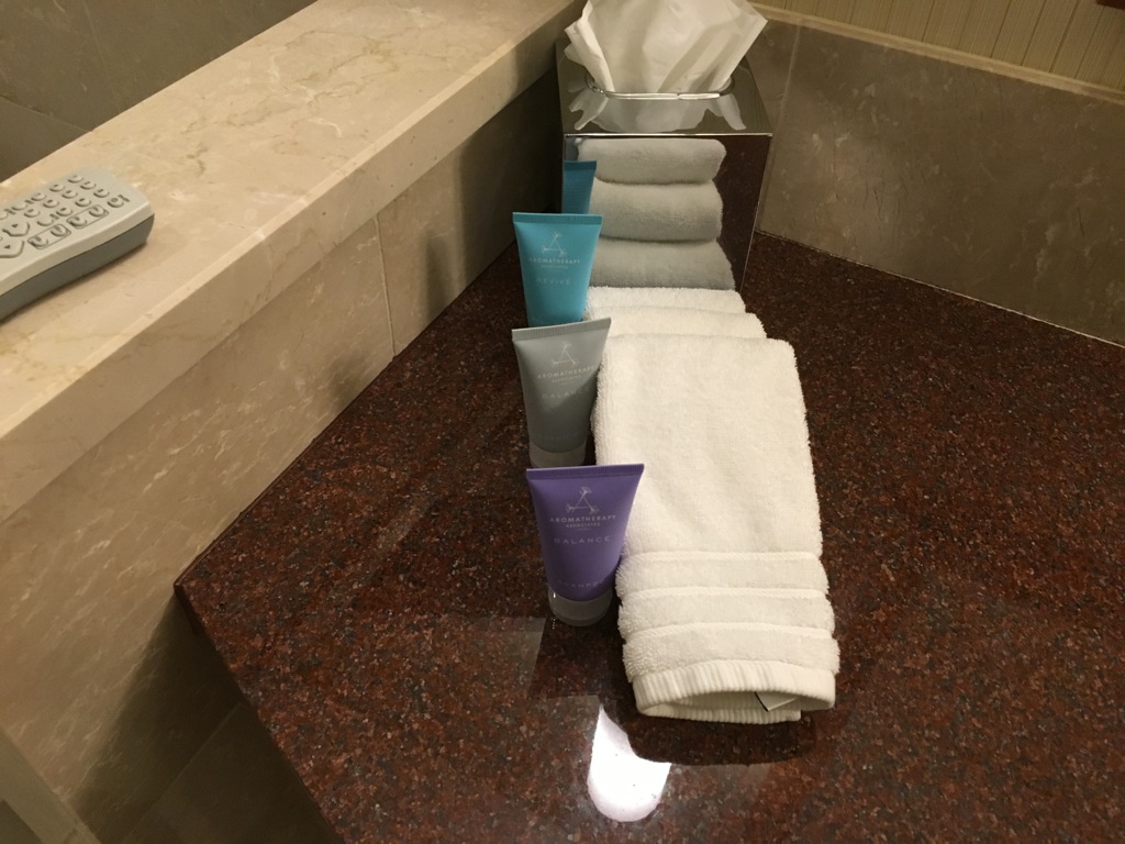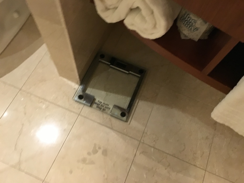 Die Badezimmer Amenitys waren, wie man es von Conrad Hotels gewohnt ist, sehr umfangreich. Neben dem üblichen Duschzubehör lag auch bereits ein Rasier Set auf dem Zimmer. Was mich persönlich gewundert hat war, dass keine Zahnbürste bereit lag. Dies ist eigentlich Conrad Standard. Auch eine Körperwaage findet man wohl im Badezimmer eines jeden Conrad Hotels auf der Welt. So natürlich auch im Conrad Indianapolis.