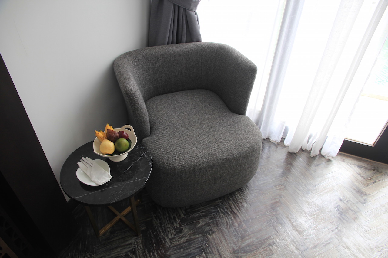 Gegenüber vom Bett befand sich eine große Türe, die nach draußen in den Außenbereich führte. Links davon befand sich noch ein weiterer Sessel mit Beistelltisch. Hier wartete auch eine kleine Obstschale auf uns.