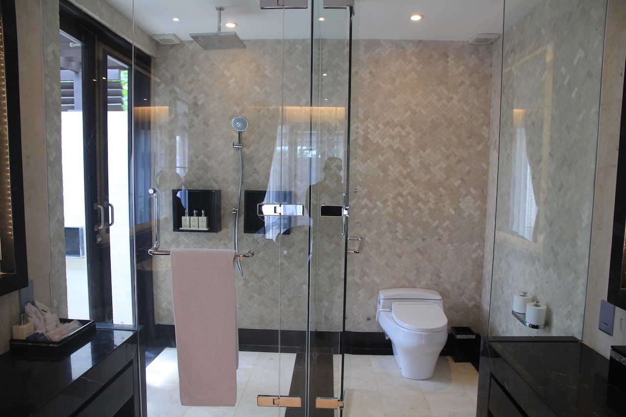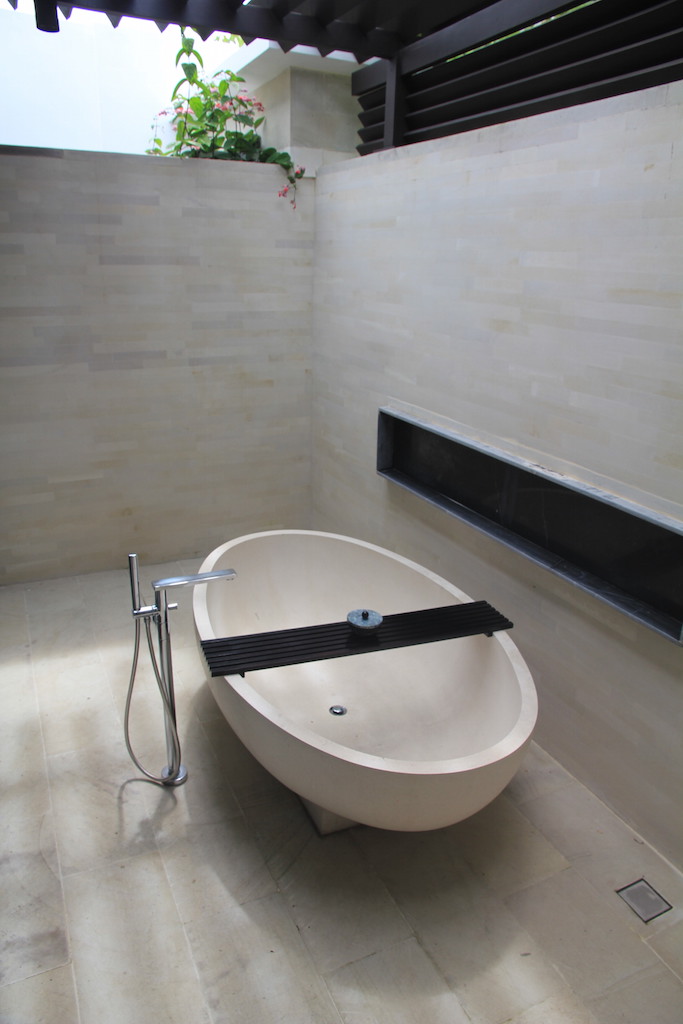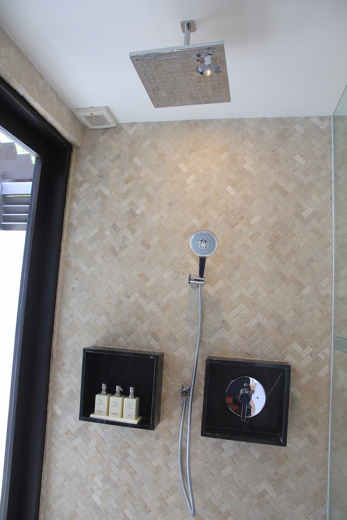 Ich habe mir noch die Sunrise-Villa mit zwei Schalfzimmern angesehen. Diese verfügt über einen Infinity Pool mit tollem Blick in die Natur und das entfernte Meer. Auf jeder Seite befindet sich jeweils ein Schlafzimmer mit eigenem Badezimmer. Der Wohnbereich ist überdacht, aber trotzdem im Freien gelegen.
