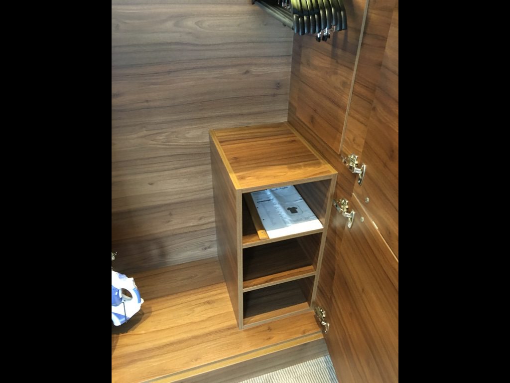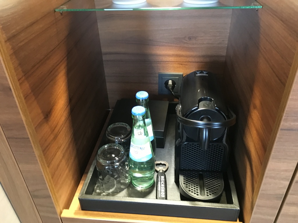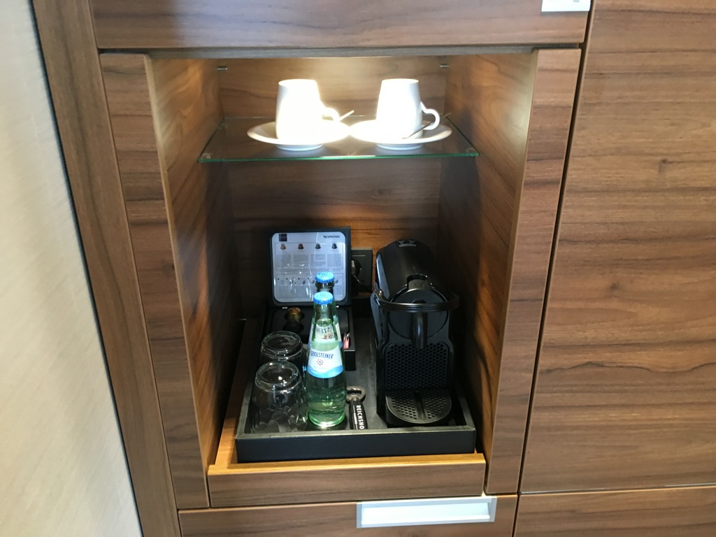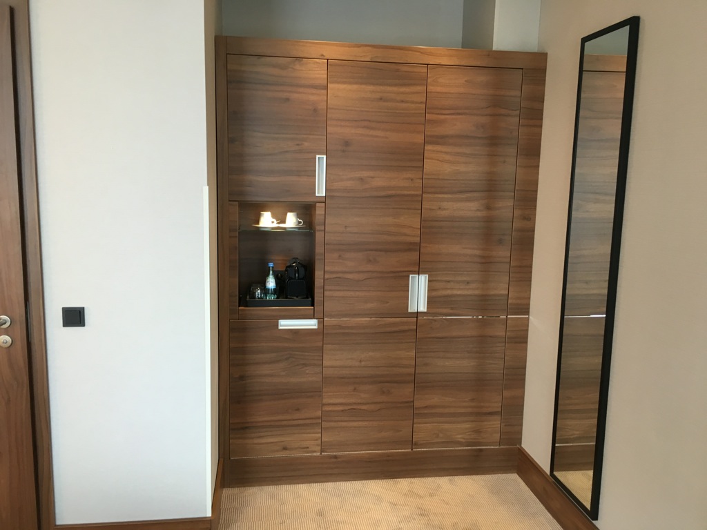 Neben dem Sessel und dem TV Gerät befindet sich im Schlafzimmer auch noch der mit Holz vertäfelte Kleiderschrank. Hier ist auch die Nespresso Kaffeemaschine, zwei Flaschen Wasser sowie die Minibar untergebracht. Wobei Minibar eine falsche Beschreibung ist. In dem kleinem Kühlschrank befanden sich zwei kleine Flaschen Sekt zur Begrüßung für die Gäste. Wer die Minibar aufgefüllt haben möchte, kann sich natürlich etwas aus der Roomservice Karte bestellen.