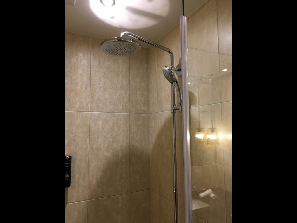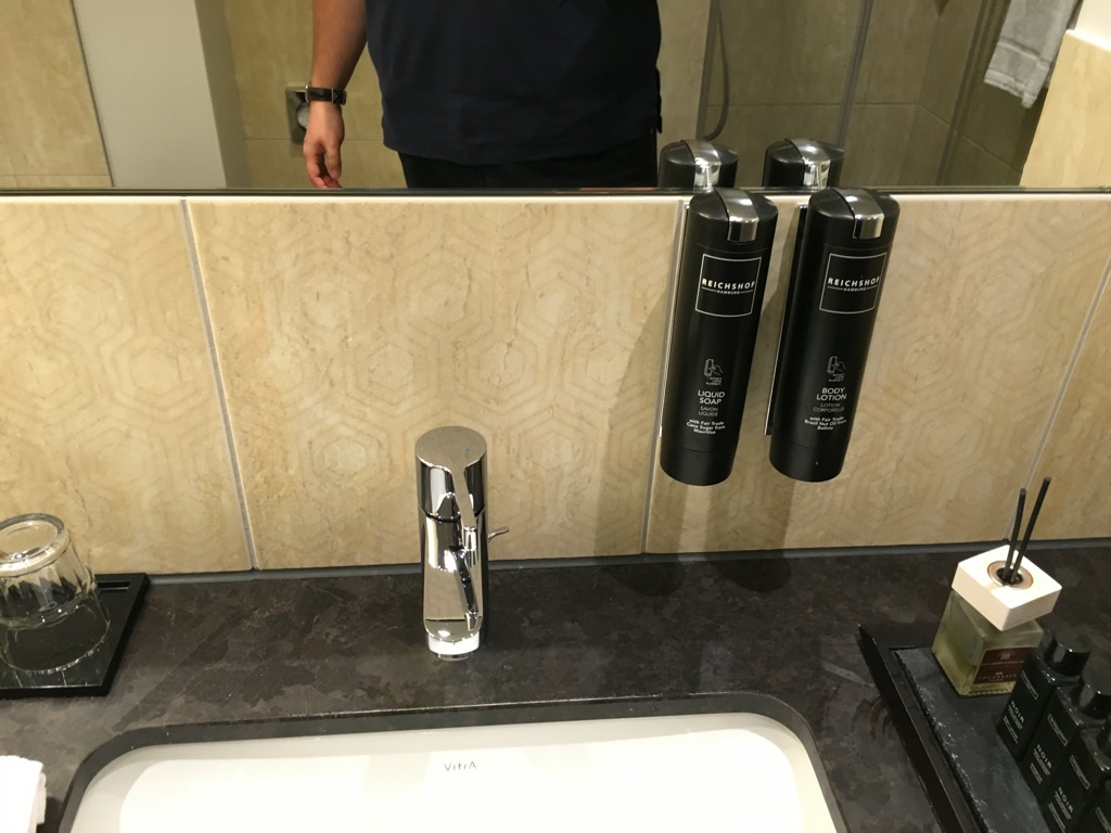 Das Bad ist ausreichend groß und verfügt sowohl über eine Badewanne, als auch über eine Dusche. Da der Reichshof ja ein Curio by Hilton ist, findet man im Bad nicht die Hilton Amenitys von Peter Thomas Roth, sondern Amenitys der Marke NOIR. Was ich persönlich als Stilbruch empfinde, sind allerdings die Spender für Shampoo und Conditioner in der Dusche und am Waschbecken. Allerdings muss man diese nicht verwenden, da selbiges ja auch in kleinen Fläschchen zur Verfügung gestellt wird.