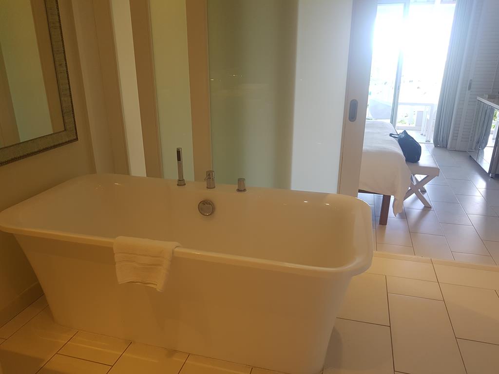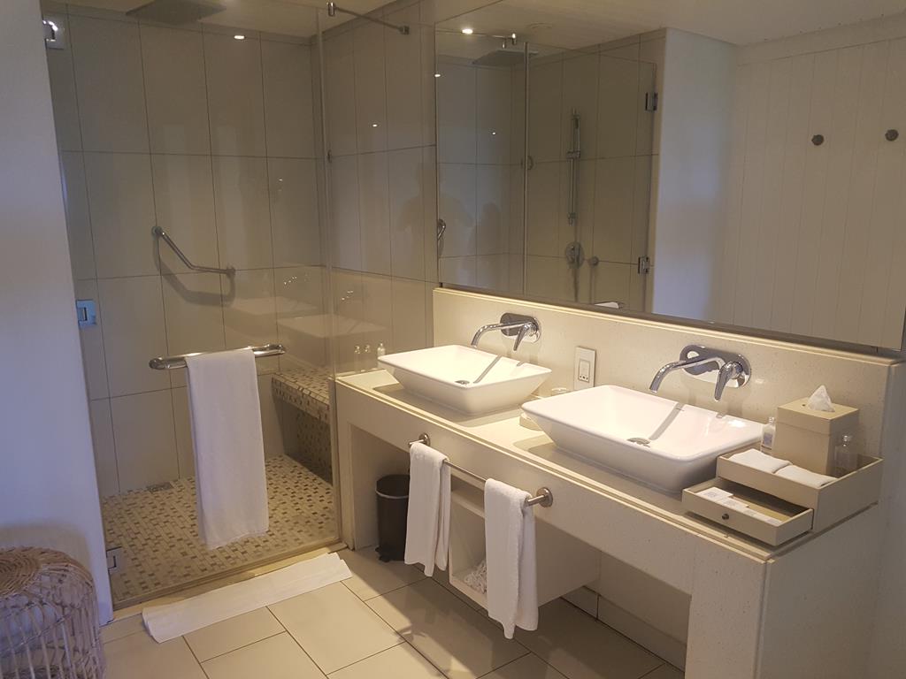 Das Bad war durch eine Schiebetür zum Schlafbereich hin getrennt und sehr großzügig gestaltet. Die Badewanne steht im Raum. Daneben befindet sich das Doppelwaschbecken mit genügend Ablagefläche. Die begehbare Dusche ist wirklich groß und verfügt über einen Regenwald-Duschkopf.