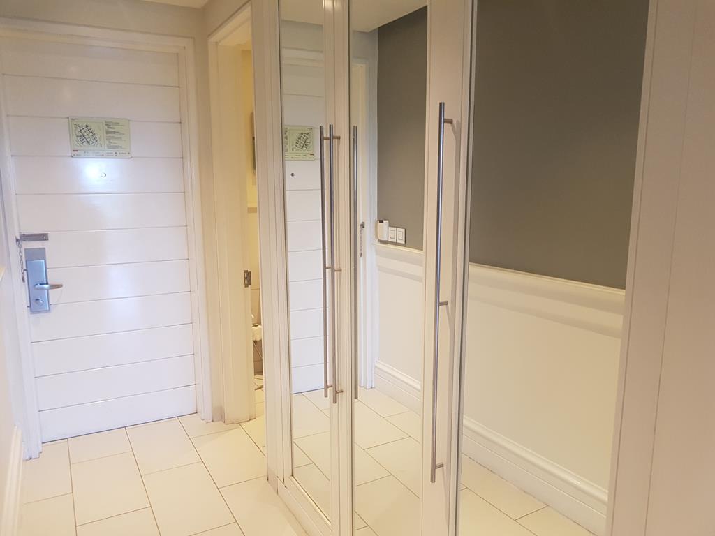 Unser Zimmer 1511 lag im zweiten Stock. Wenn man es betritt, befindet man sich zunächst in einem langen Flur, der zum eigentlichen Zimmer führt. Hier befindet sich links die Toilette. Dahinter liegt ein großer mit Spiegeln verkleideter Einbauschrank.