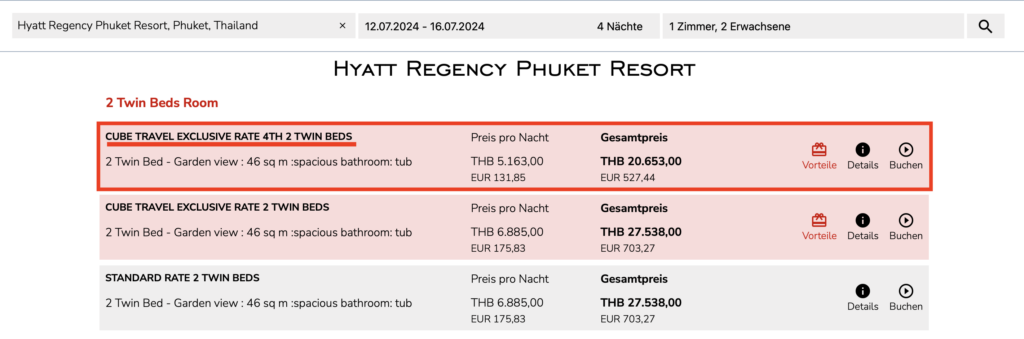 Hier ein Beispiel vom Hyatt Regency Phuket, welches neben der oben gezeigten 4 for 3 Rate auch die 25% teurere Standard Rate anbietet. In unserem Portal wird sie „CUBE TRAVEL EXCLUSIVE RATE 4TH“ genannt, da sie von unserem Partner Cube:Tavel in Berlin bereitgestellt wird. Dabei gibt es dieses Angebot mit den kostenlosen Nächten im Park Hyatt Dubai auch für die Suiten und Premium Suiten, was außergewöhnlich ist und gerade wenn man ein großes Zimmer braucht natürlich sehr hilfreich ist.