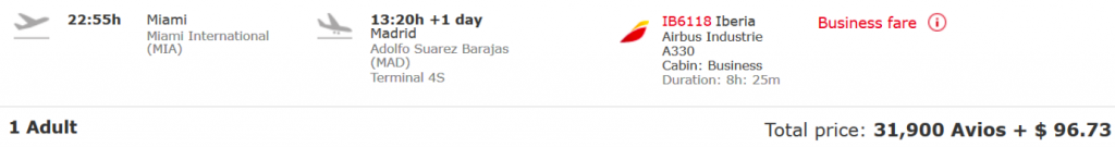 Beispiel: Business Class Miami nach Madrid in der Business Class für 31.900 Avios.