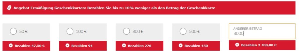 - Beliebiger Gutscheinwert zwischen 501€ und 3.000€ (-10% Rabatt)