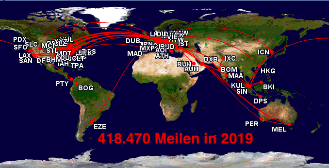 2020 ist nun schon einige Tage alt und während ich diese Zeilen schreibe, befinde ich mich bereits auf meinem dritten Flug im neuen Jahr und habe schon wieder fast 7.000 Meilen zurückgelegt. Seit ich diesen Blog schreibe, habe ich jedes Jahr zu Neujahr mein persönliches Vielfliegerjahr in Zahlen Revue passieren lassen und auch wenn es sich für den ein oder anderen nach schierer Angeberei anhört, ist es für mich auch eine Art jedes Jahr abzuschließen und mich daran zu erinnern, wie viel ich unterwegs war.