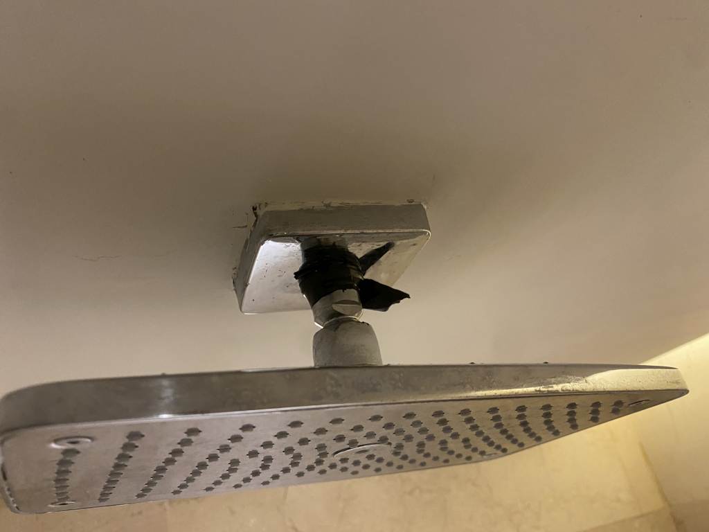 Es war dann mittlerweile Zeit, die neue Suite zu beziehen. Zwischenzeitlich hatten wir erfahren, dass derzeit nur 40 Zimmer überhaupt genutzt werden können und der Rest noch renoviert wird. Das erklärte die Herausforderungen ein passendes Zimmer für uns zu finden. Es erklärte jedoch nicht, warum sich dann doch auch deutliche Mängel an unserer Suite wiederfanden. Nicht nur, dass es nicht sauber war. Denn meine Frau musste die Brüstung an der Terrasse erstmal mit einem nassen Handtuch putzen und ich hatte mit Griff an die falsche Stelle im Schrank eine dicke Staubschicht auf dem Finger. Nein, es wirkt auch an anderen Stellen nicht wirklich renoviert. So hing der Duschkopf schief und das Rohr war mit Klebeband geflickt.