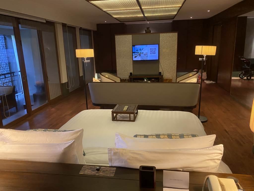 Nun hatten wir kein Ocean-View gebucht, weil uns der Meerblick nicht wichtig ist, aber so hatten wir es uns nicht vorgestellt. Daher bat mich meine Frau nach einem Zimmerwechsel zu fragen. Zurück an der Rezeption tat der Duty-Manager sein Möglichstes, um unseren Wunsch zu erfüllen. Okay, ehrlichweise war der erste Vorschlag, zusätzliche Lampen aufzustellen. Aber er fand zu guter Letzt für uns eine Alternative, die jedoch kein Late-Checkout erlaubte. Da wir davon keinen Gebrauch machen wollten, zeigte er mir die Suite. Dieses Mal landete ich in einer One-Bedroom-Suite mit Ocean-View und etwa 130qm.